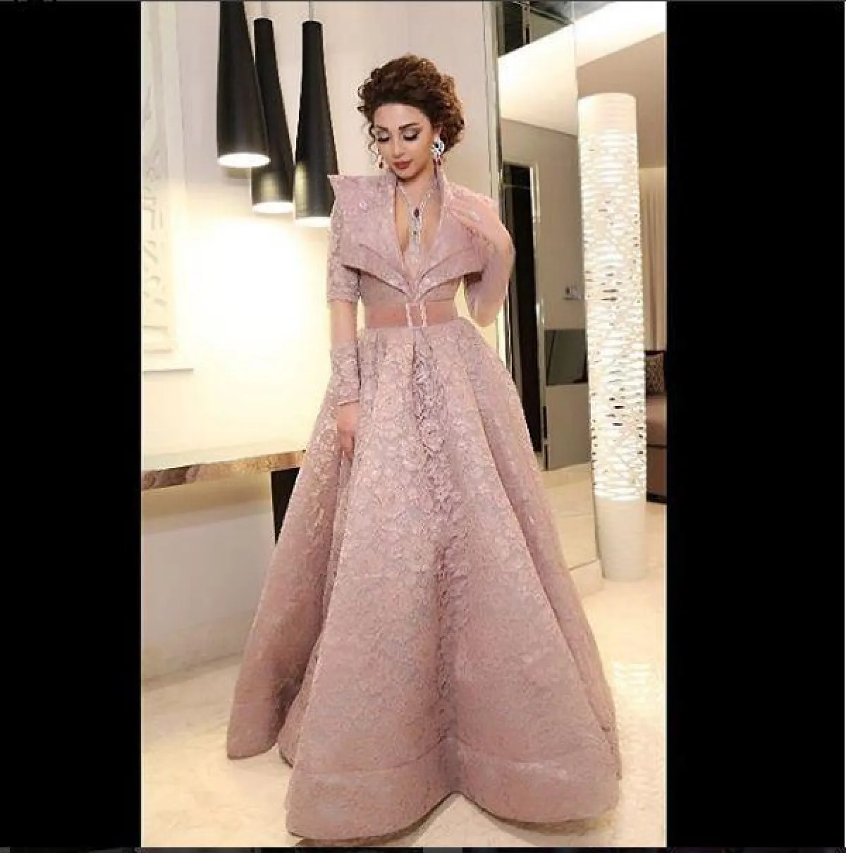 في أجدد إطلالاتها، لفتنا الفستان من التول والدانتيل الناعم، بدرجة الباستيل الروز، وقد اختارت رفع شعرها للوراء، ليتناسب مع الياقة المقفولة للفستان.