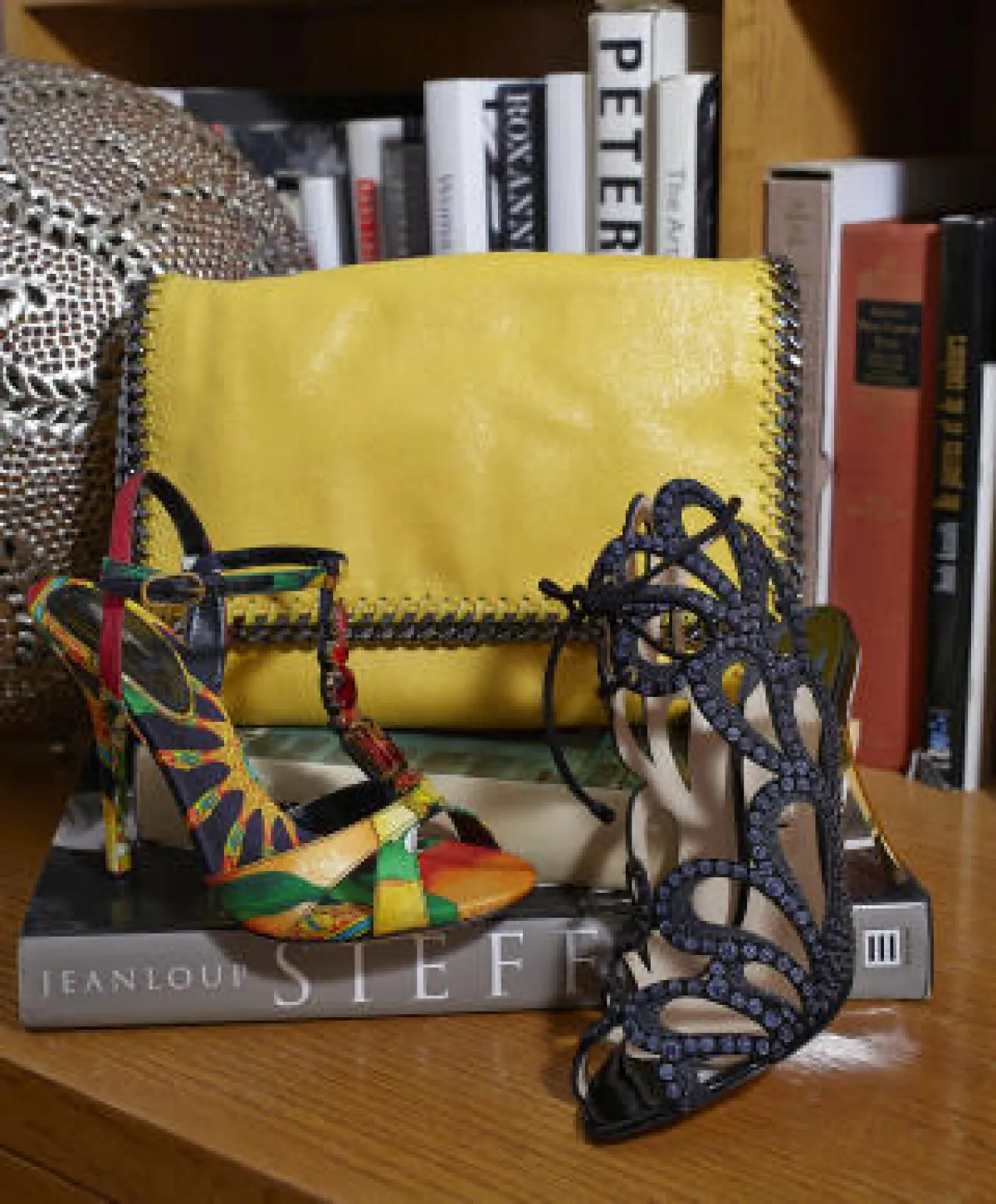 - حذاء باللون الأسود. حقيبة ملونة من Fendi.