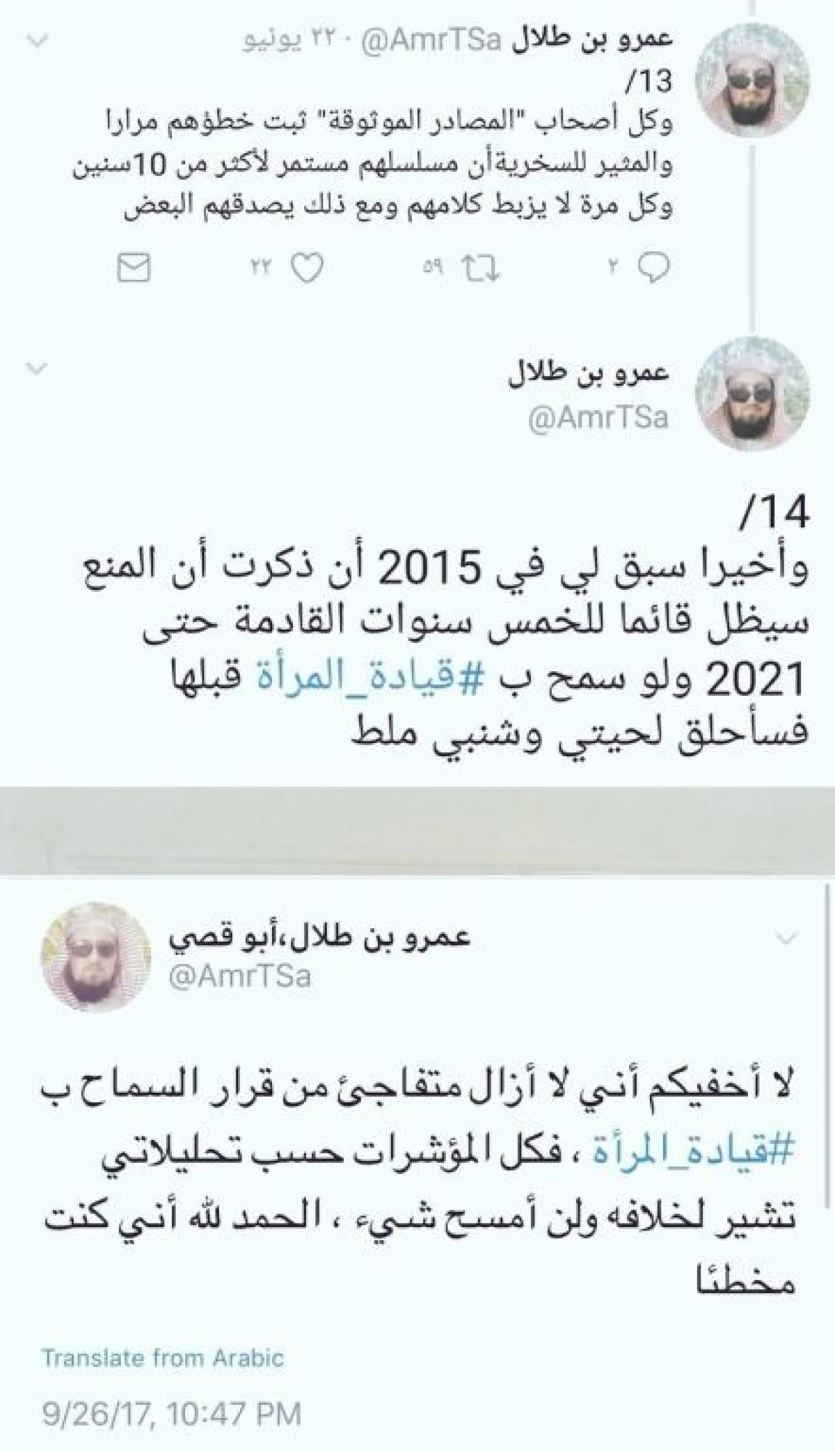 وقال عمرو بن طلال أبو قصي عبر حسابه في "تويتر": "مقطع حلقي لحيتي وشاربي كاملاً جاء بعد أن وعدت عام 2016 بأن أحلقهما إذا تم السماح بـ #قيادة_المرأة_السيارة قبل خمس سنوات، وهو ما حدث فعلاً، ولم يكن متوقعاً أبداً".