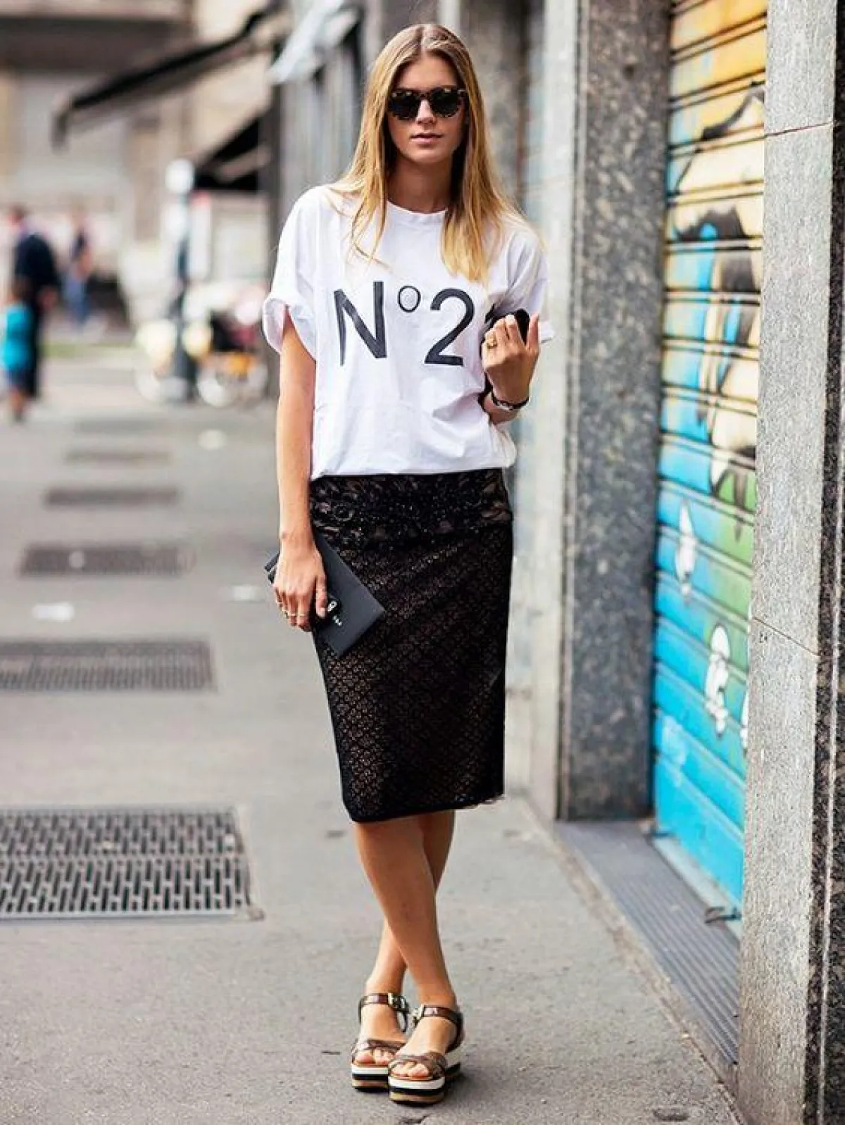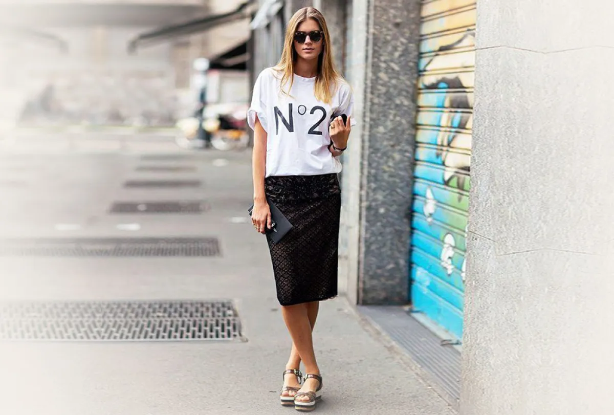 يمكنكِ كذلك ارتداء تنورة القلم الرصاص Pencil skirt التي عادًة ما نجدها مع الجاكيت الكلاسيكي أو القميص الشيفون، أو البلوزة الخاصة بالعمل، لكن الآن يمكنكِ تغيير الإطلالة ككل بارتداء تنورة قلم الرصاص Pencil skirt مع التيشرت، لإطلالة رشيقة. أما عن الحذاء المناسب لهذه الإطلالة فيمكنكِ اختياره حسب ذوقكِ سواء كان بـ الكعب العالي الصيفي الملون، أو السنيكرز الفلات.
