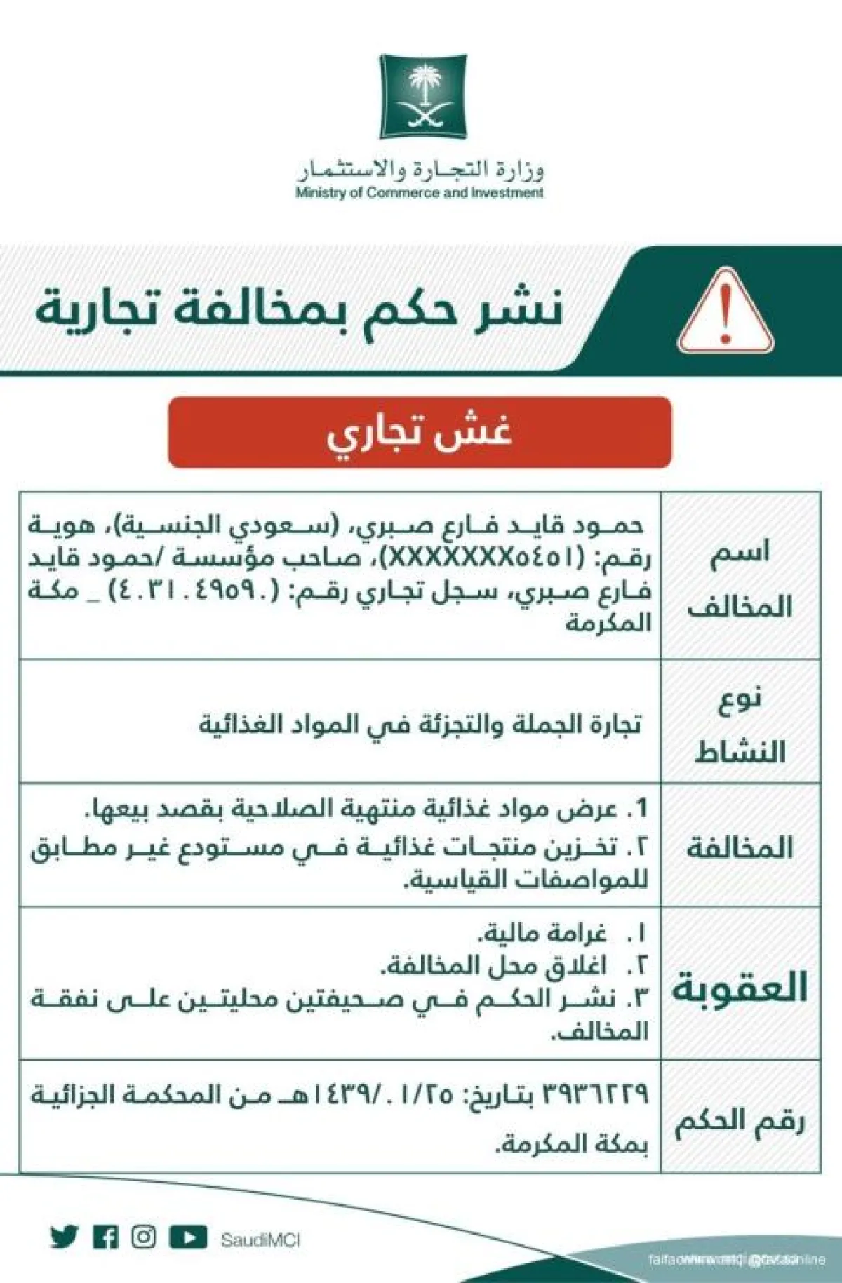 شهرت وزارة التجارة والاستثمار بمالك مؤسسة تختص بتجارة الجملة والتجزئة في المواد الغذائية بمدينة مكة المكرمة، وذلك إثر تورط القائمين عليها في مخالفة نظام مكافحة الغش التجاري من خلال عرض وبيع مواد غذائية منتهية الصلاحية، وتخزين منتجات غذائية في مستودع مخالف للمواصفات القياسية المعتمدة.