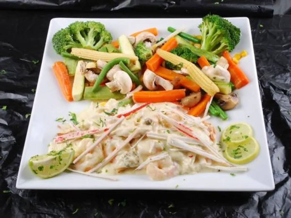2-اشوي السمك ثم ضعيه في طبق التحضير، وأضيفي عصير الليمون والكمون، ثم أضيفي الجمبري المسلوق، ثم أضيفي الصوص الأبيض وقلبي الخليط، ثم ضعي الخضار المسلوق في النصف الآخر من طبق التحضير ثم رشي شرائح الكابوريا على الوجه للتزيين.