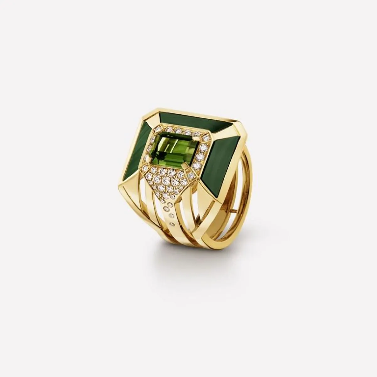 كذلك لفتنا خاتم شانيل CHANEL الذي قدّمته ضمن مجموعتها ماي غرين My Green والمصنوع من الذهب الأصفر وحجر المالاكيت ويتوسطه حجر التورمالين مع حبيبات الماس البرّاقة.