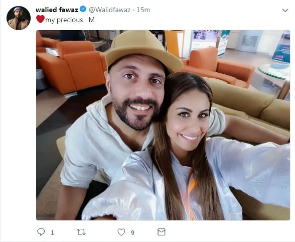 نشر الفنان وليد فواز صورة سيلفي تجمعه بزوجته مي سليم، في أول تعليق له بعد زواجهما، وكتب تعليقًا على الصورة : "الغالية".