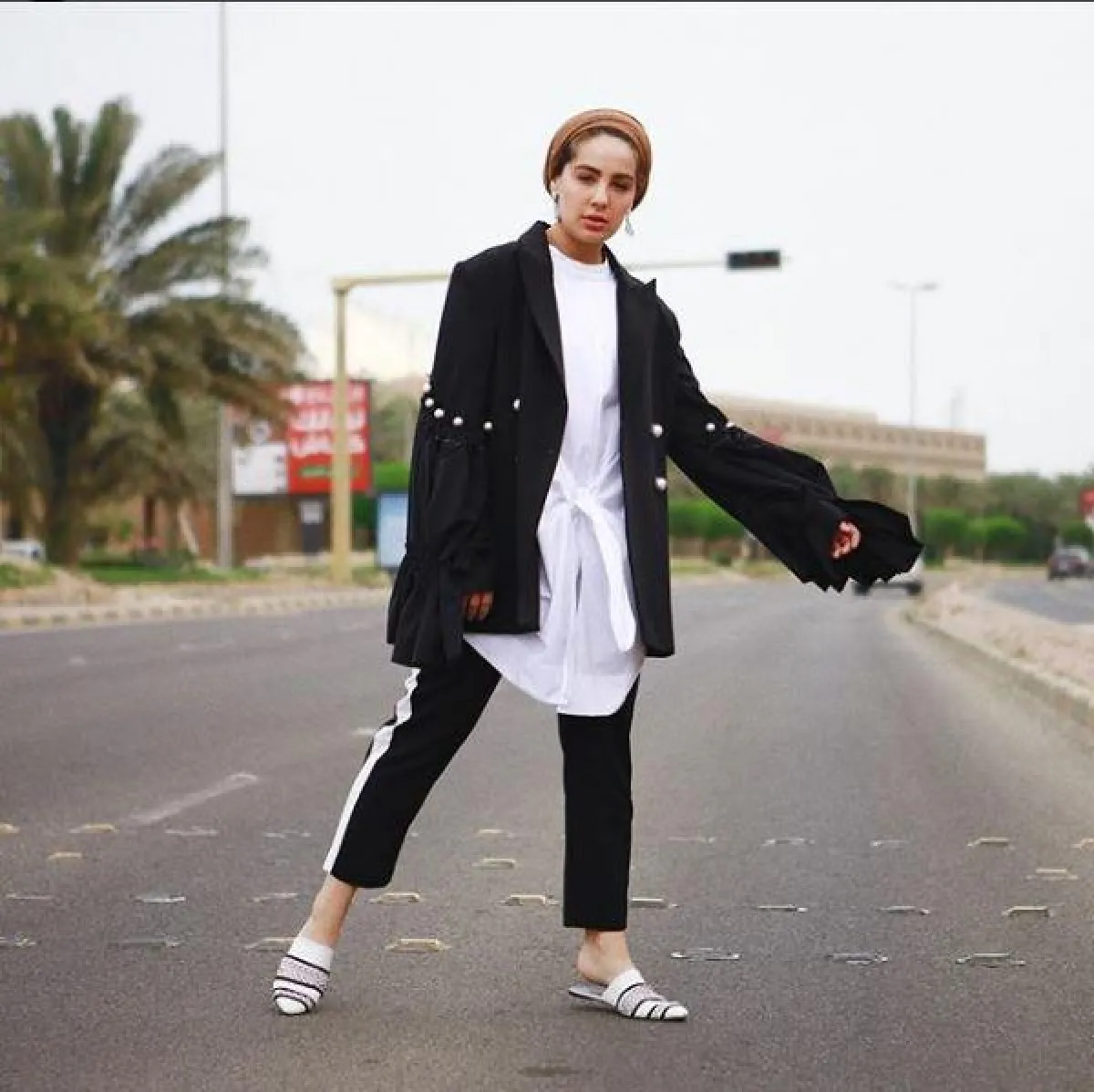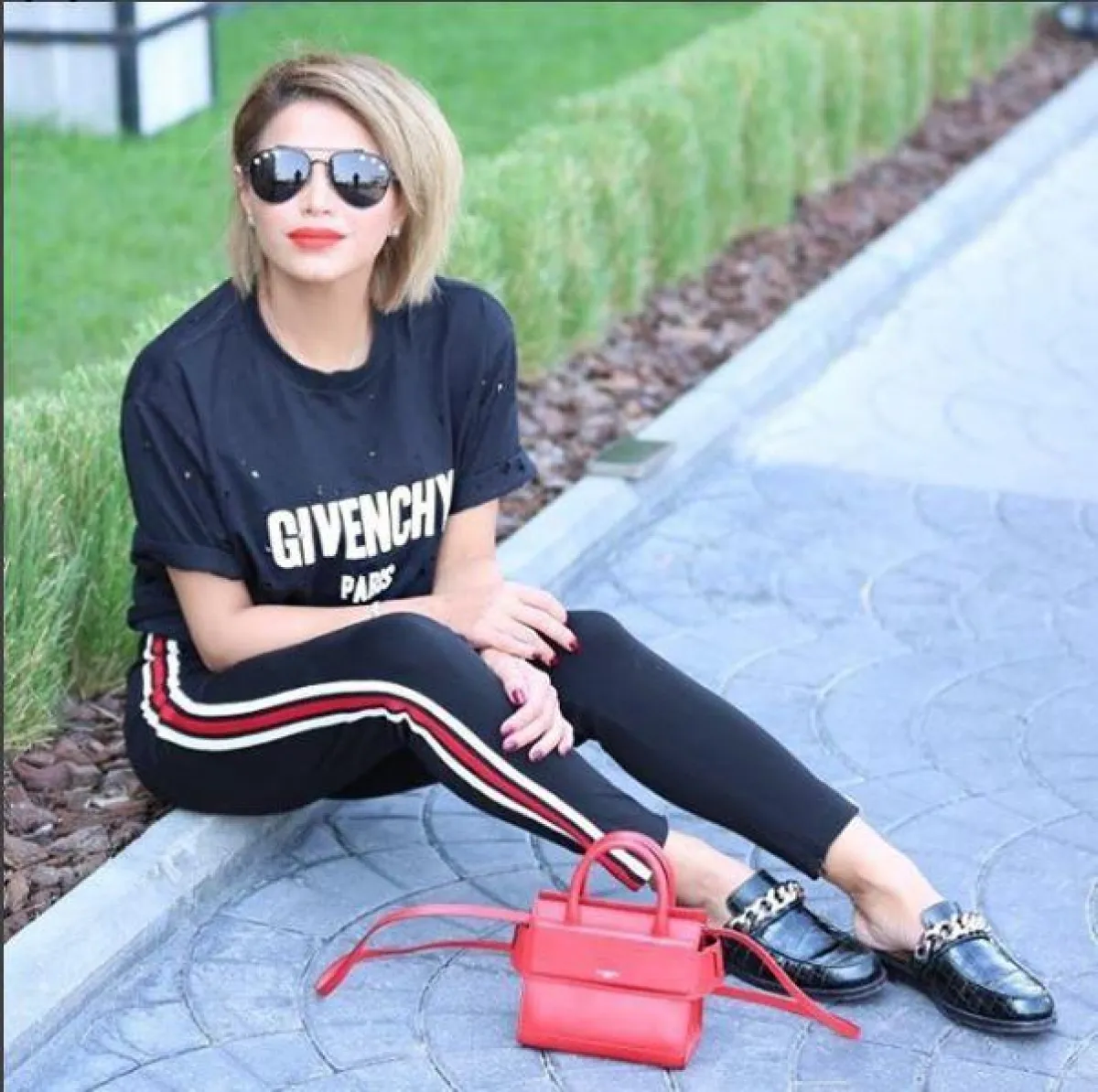 اختارته مدونة الموضة والإعلامية نهى نبيل مخططًا من الجنبين، واختارت معه تيشرت كاجوال طويلًا، بنصف أكمام واسعة من جيفنشي Givenchy، وصندلًا مفتوحًا.