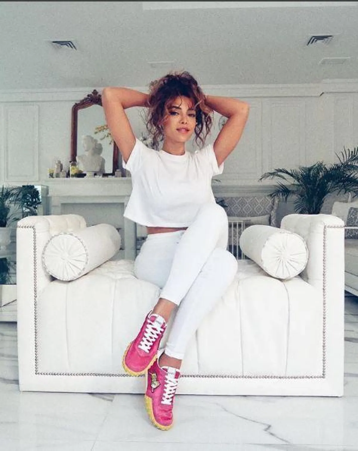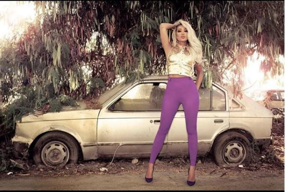ولفتنا أيضًا اختيارها للـ بنطلون الرياضي اللامع المستوحى من التسعينيات باللون الأرجواني الجذاب، ونسقت معه توب قصيرًا stomach فيلفت ذهبيًا، وحذاء بـ كعب عال، لإطلالة كلاسيكية تناسب جلسات التصوير.