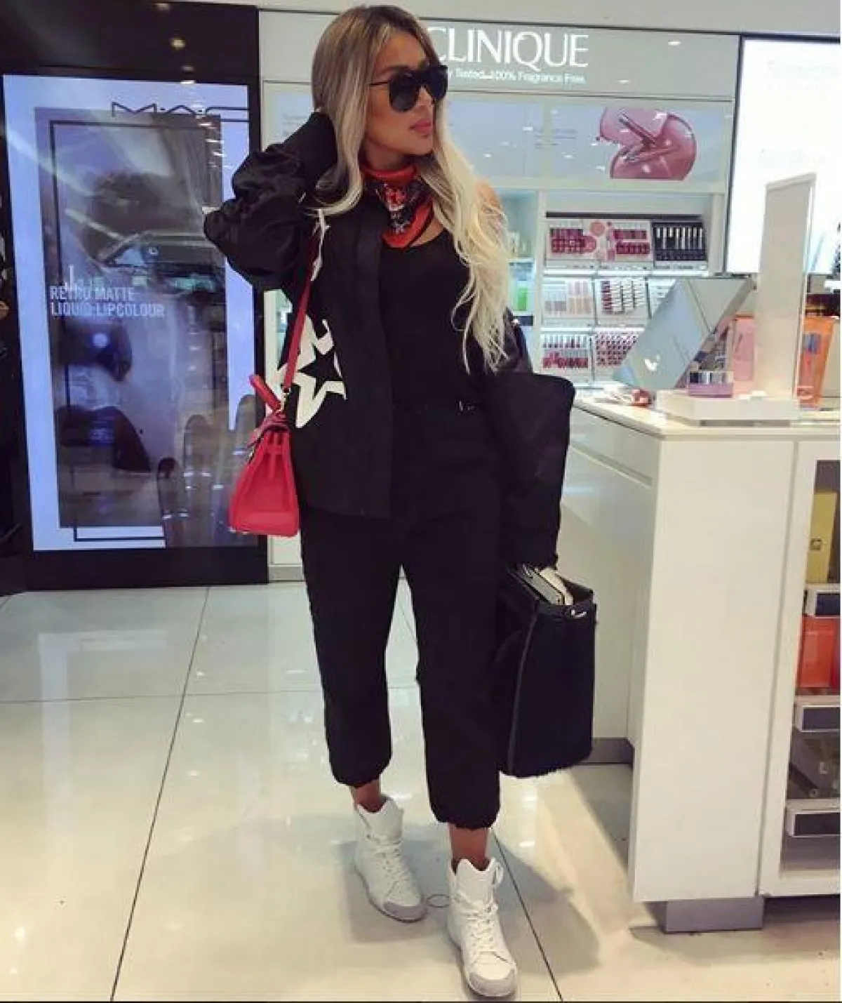 اختارت النجمة اللبنانية مايا دياب السروال الرياضي بكافة أشكاله وتصاميمه، منها هذا التصميم الواسع، الضيق من ناحية الكاحل، مع السنيكرز الأبيض، والجاكيت الجينز، لإطلالة مريحة تناسب أجواء السفر.