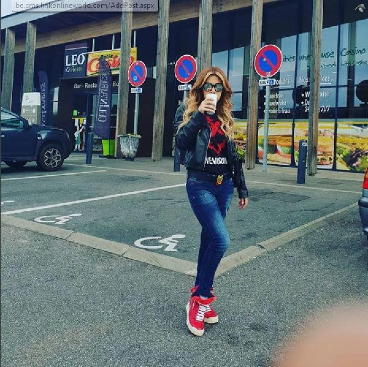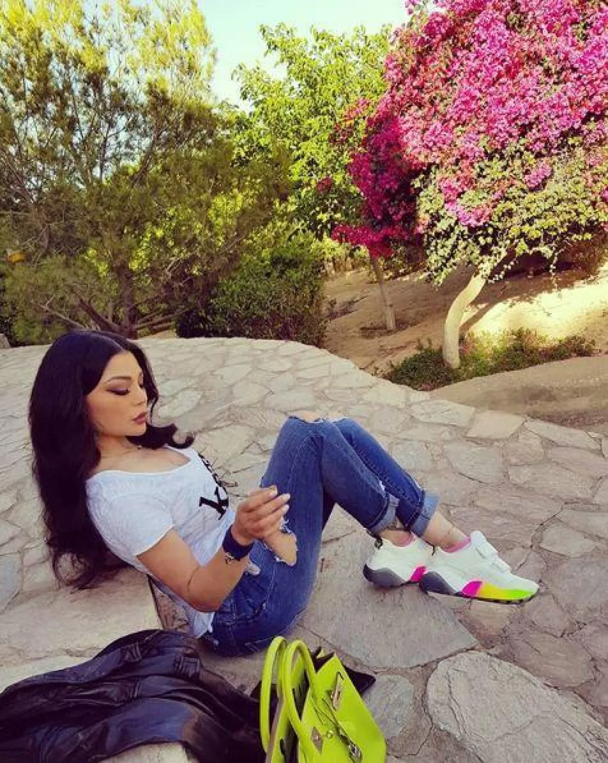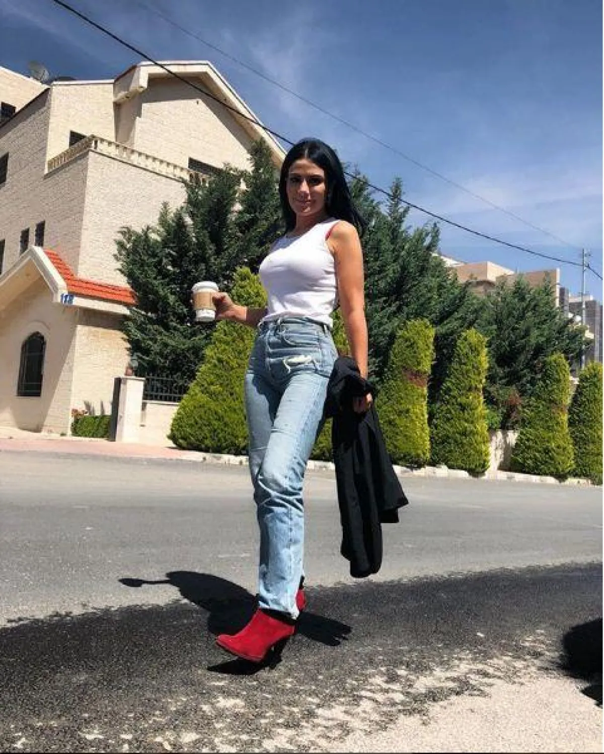 لفتتنا البناطيل الجينز التي تختارها النجمة الأردنية صبا مبارك، خاصًة أنها تميل إلى البناطيل عالية الخصر المستوحاة من الثمانينات، لإطلالة رشيقة وجذابة، وطالما تختار معها أحذية لافتة للنظر، مثل هذا الحذاء الأحمر.