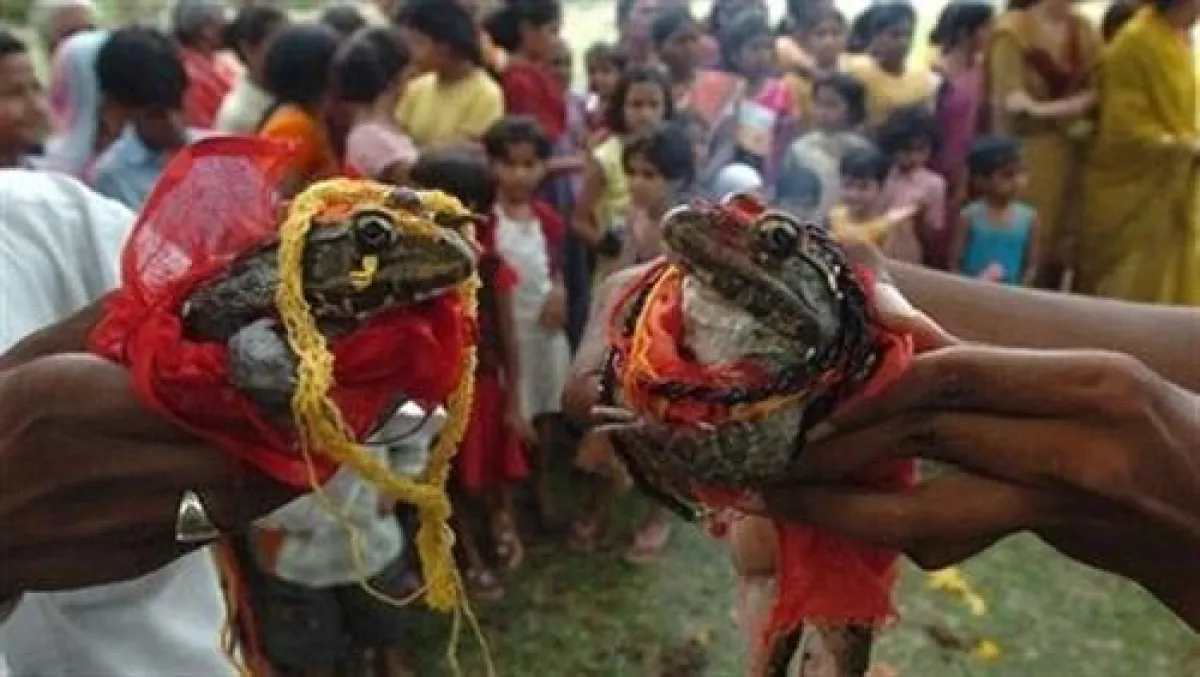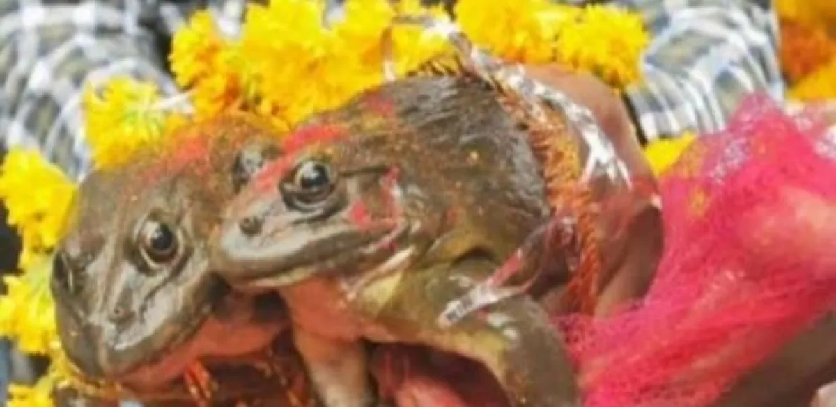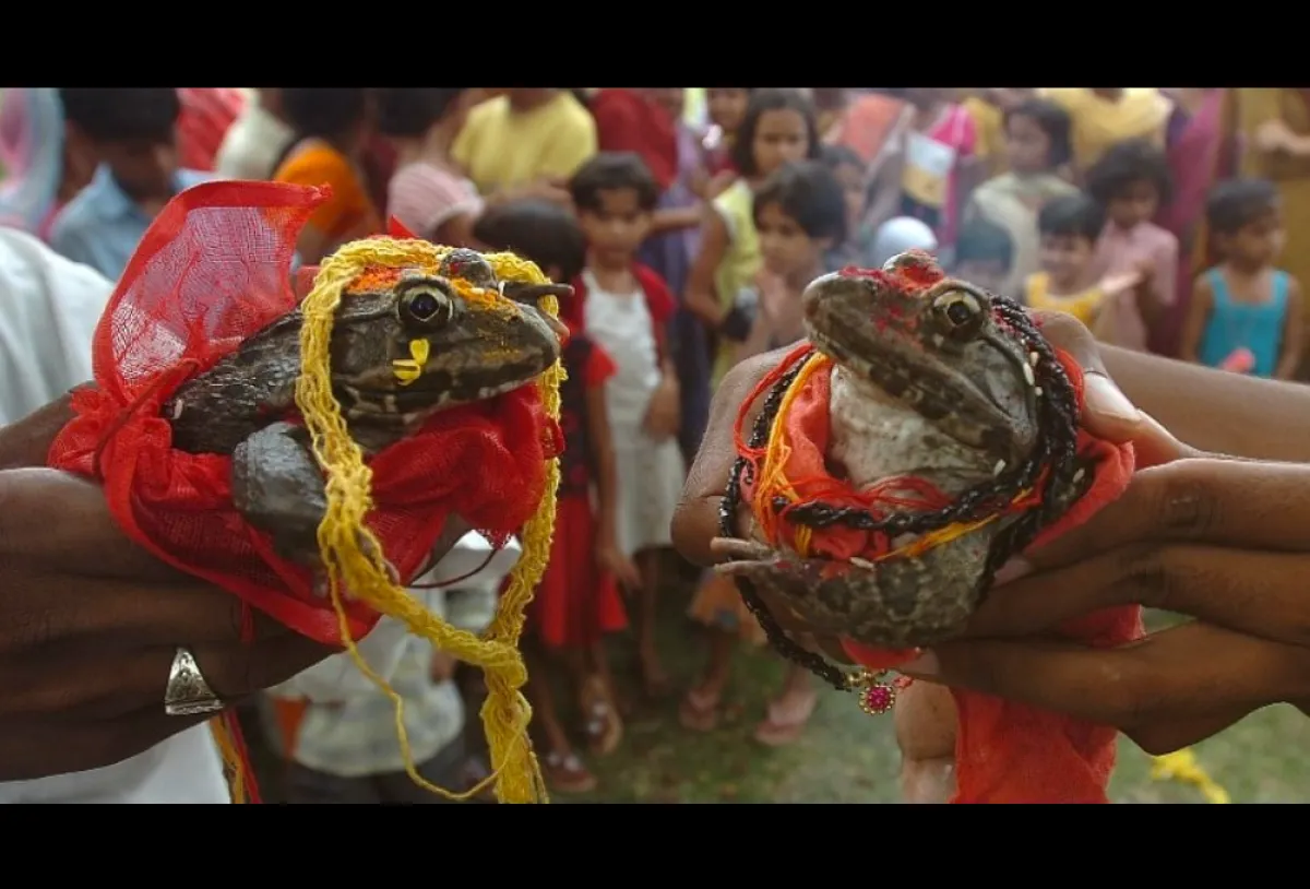 ربما تصلح هذه القصة لإحدى الأساطير والأزمان الغابرة، إلا أن الأمر ليس كذلك، فهي تحدث الآن وفي زمننا هذا من العام 2018، حيث أقامت «جهات رسمية» في إحدى الولايات الهندية حفل زفاف لـ«ضفدعين» -أجل لضفدعين- وبحضور مسؤولين رفيعي المستوى في البلاد؛ وذلك بهدف الحصول على المطر، بسبب موسم الجفاف التي تعيشه الهند.
