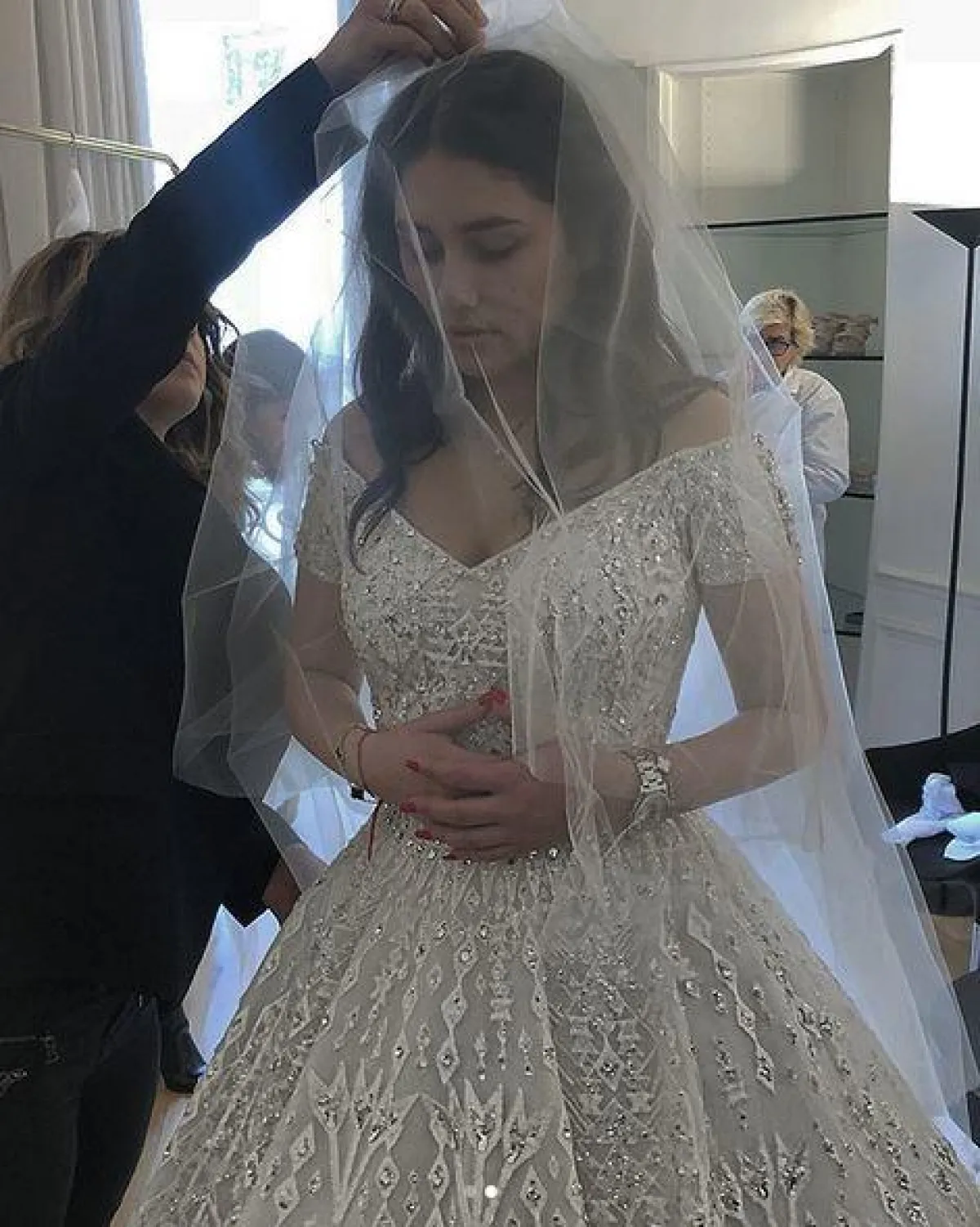 ارتدت العروس فستان زفاف مميزًا من تصميم اللبناني زهير مراد، وتميز بأكمامه المندسلة وتطريزاته البرّاقة، وأكملت الفستان بـ طرحة رومانسية وذيل طويل، ويُذكر أنّ بعض المواقع ذكرت أنّ سعر الفستان بلغ أكثر من 270 ألف دولار أمريكي.