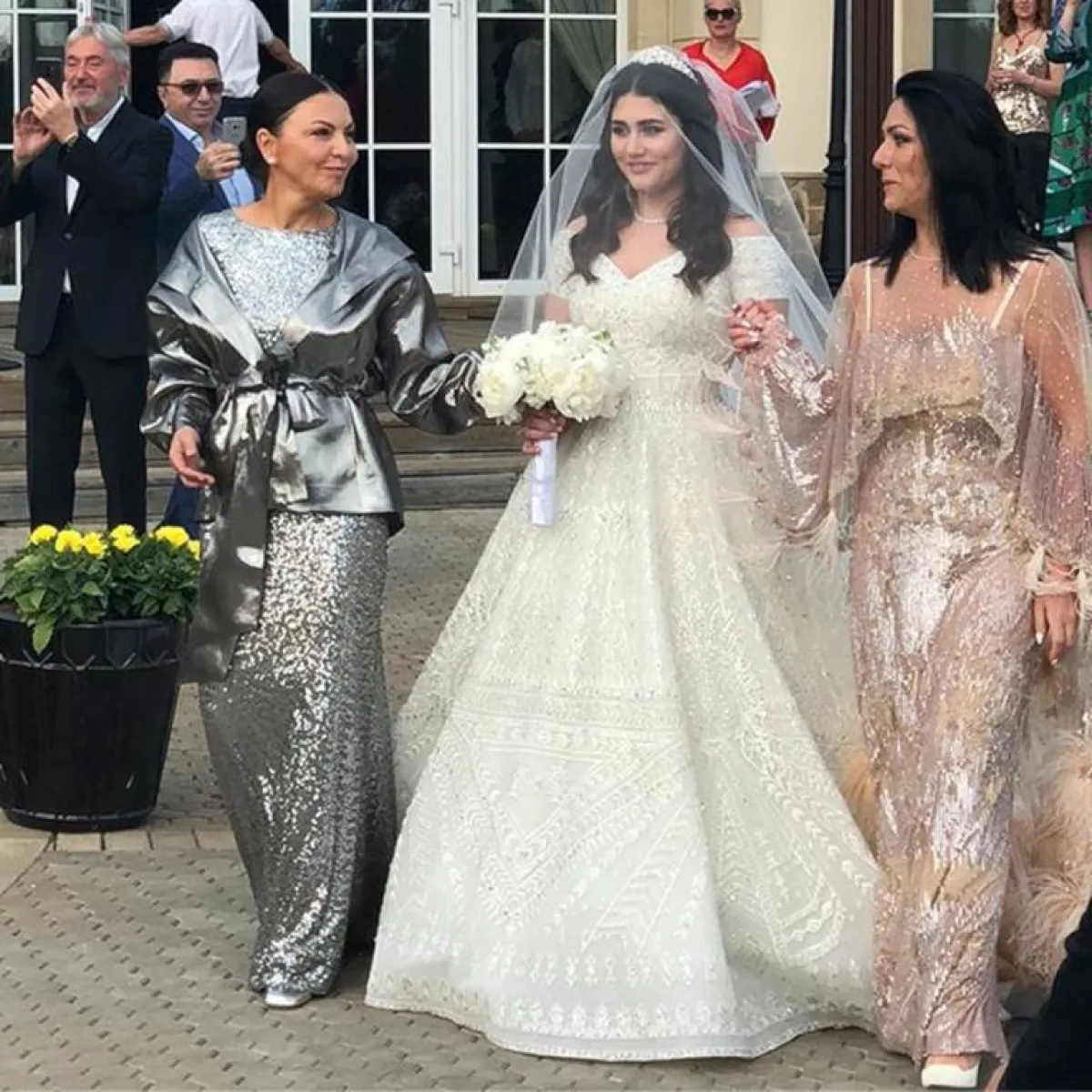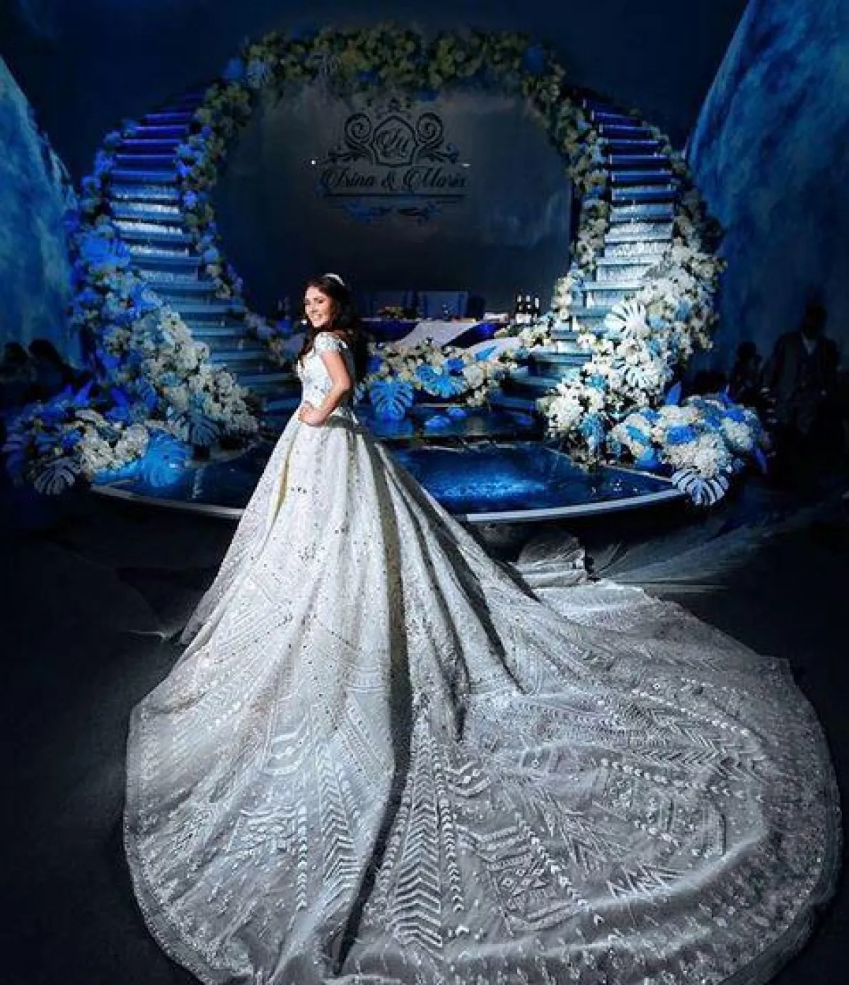 استغنت العروس عن التسريحات الفخمة واختارت الشعر المنسدل لتسريحة زفافها، مع أكسسوار ناعم زيّن مقدمة رأسها، وانتشرت الصور التي تجمع العروس بنجوم من روسيا والعالم، وظهرت فخامة الزفاف من خلال الكيكة العملاقة التي أتت على شكل نافورة.
