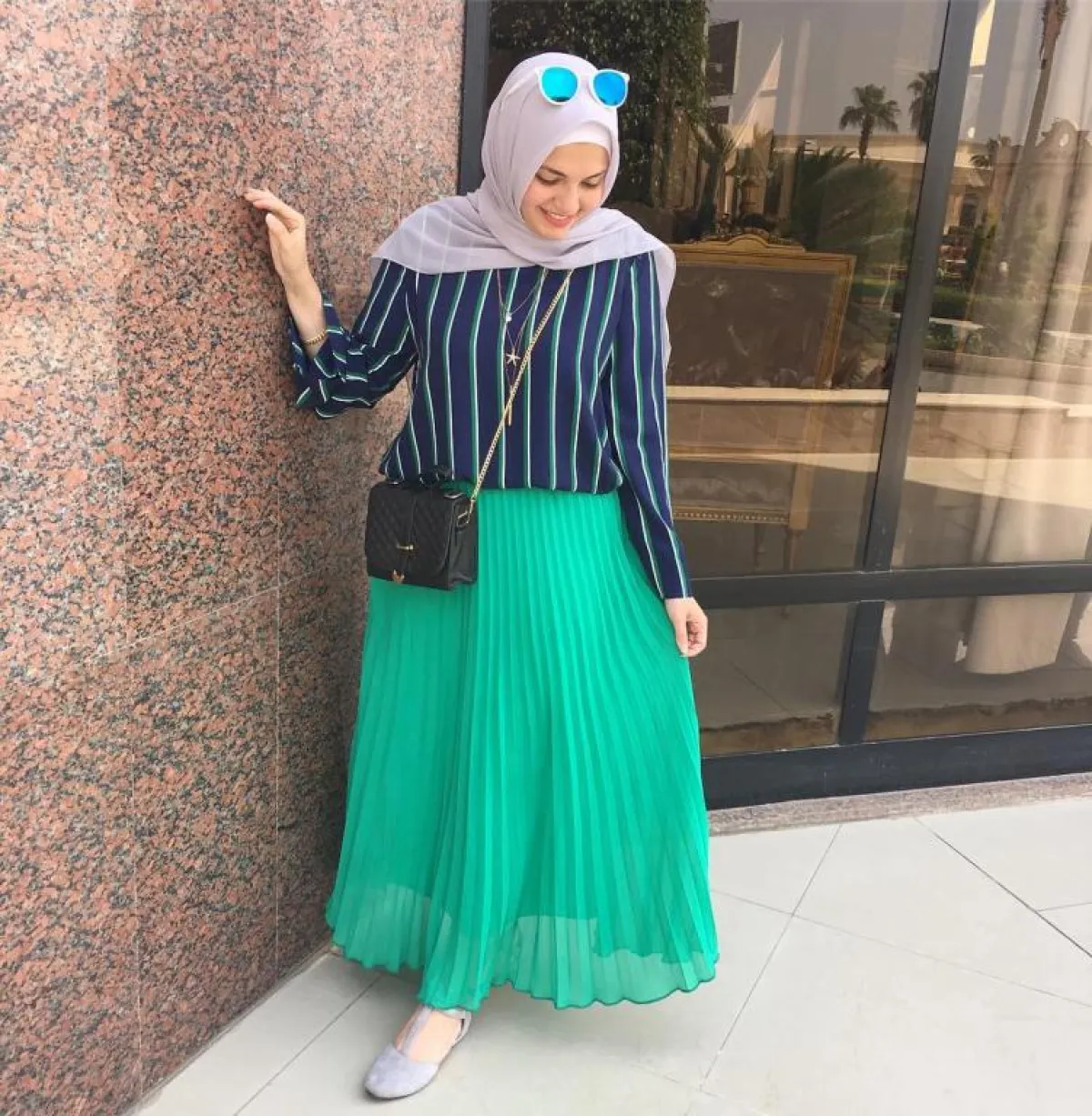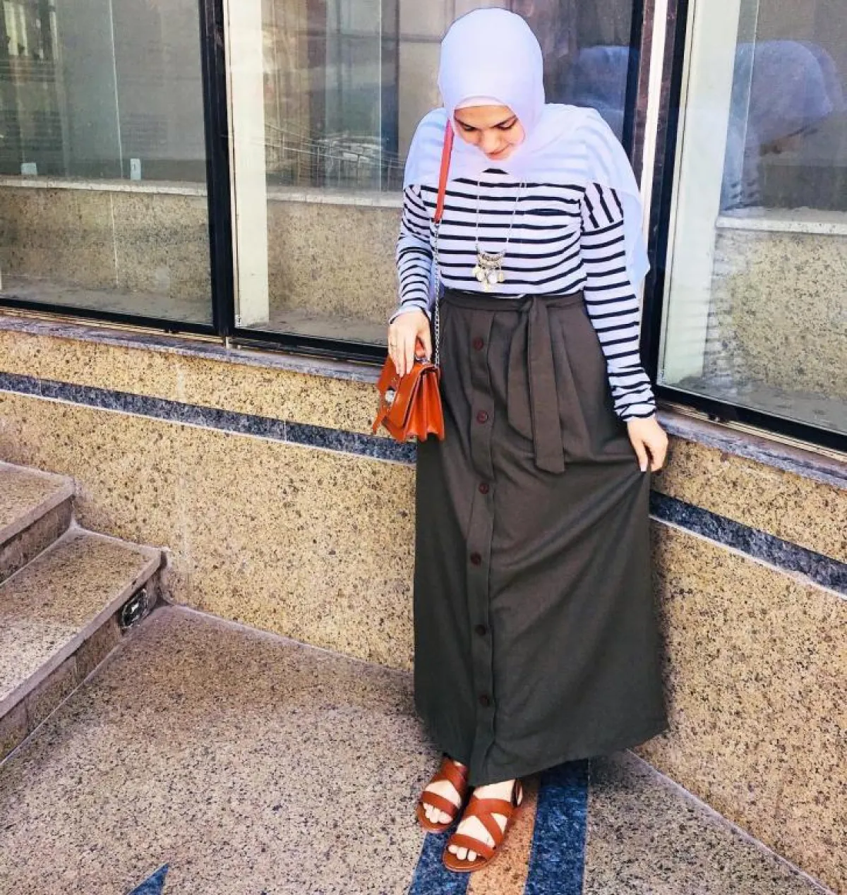 نسقت تنورة باللون الأخضر مع بلوزة مقلمة باللون المحلي في البيج وانتعلت حذاءً باللون البيج، واعتمدت لفة حجاب جديدة.