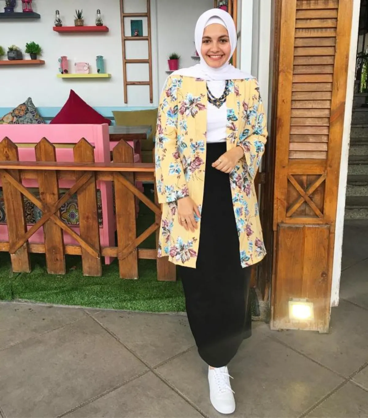 البليزر والجواكيت الفضفاضة من أحدث صيحات الموضة، ويسهل تنسيقها بكل سهولة مع تنورة مستقيمة ؛ نسقت مدونة الموضة آية فوزي تنورة باللون الأسود مع top أبيض وجاكيت طويل باللون الأصفر المزين بالأزهار.