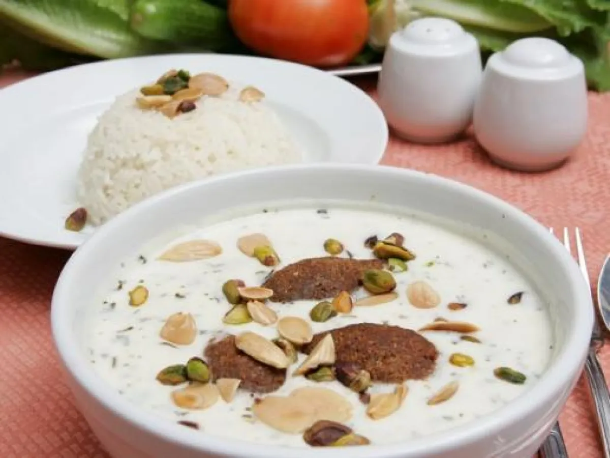 يوضع اللبن في جاط زجاج و يضاف اليه أقراص الكبة واللحمة الموزات و كويزات البصل و على وجهه الثوم و الكزبرة و الصنوبر المقلي و يقدم معها الارز الأبيض المفلفل على حدى.