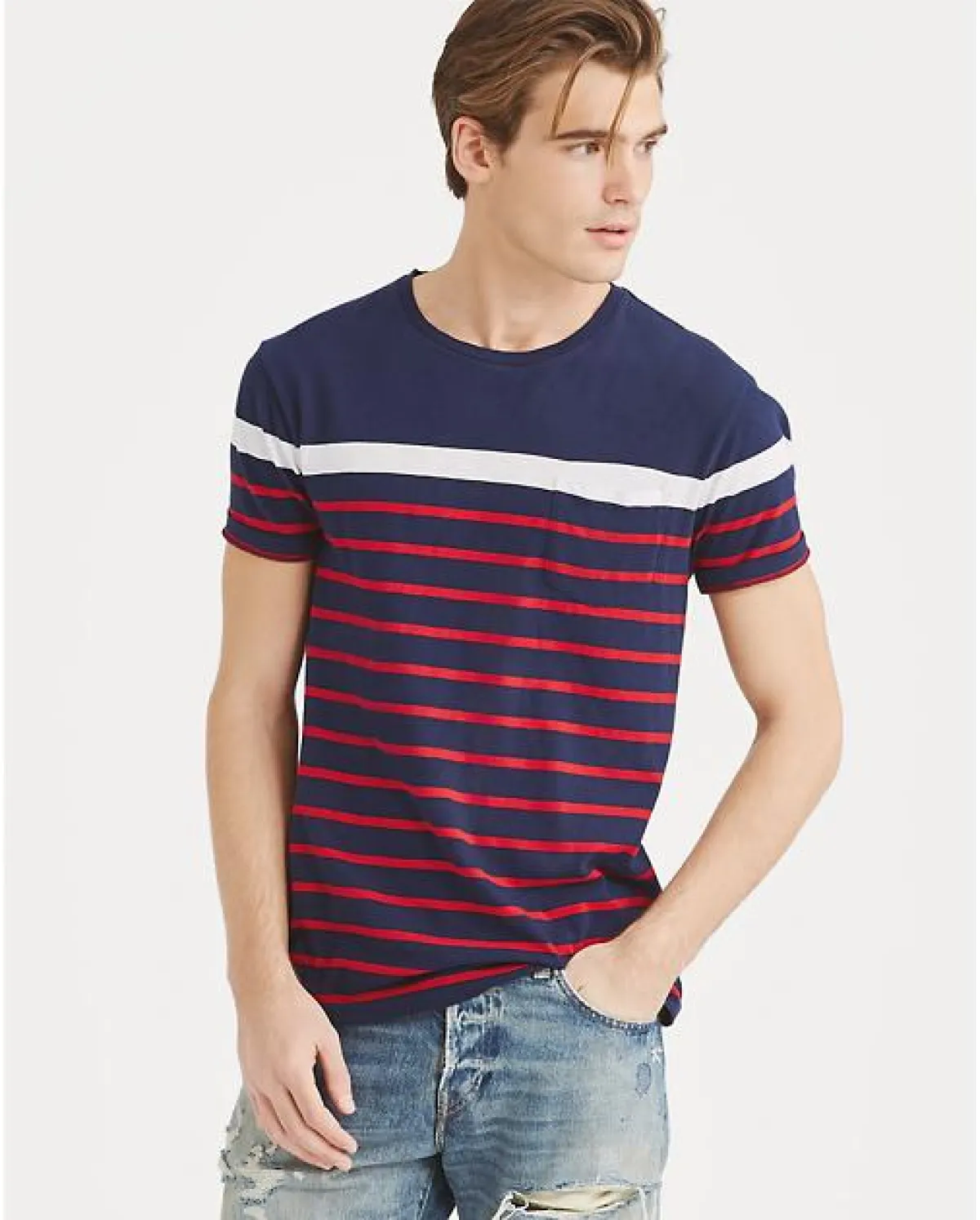 من أكثر القطع المميزة التي شاهدناها هذا العام، هو التيشرت المخطط سواء كان طوليًا أو عرضيًا، مثل هذا التيشرت الأنيق من تصميم POLO RALPH LAUREN بولو رالف لورين بالألوان، والذي يمنح الرجل أكتافًا عريضة. يمكن تنسيقه مع الجينز الفاتح، أو الشورت الأزرق.