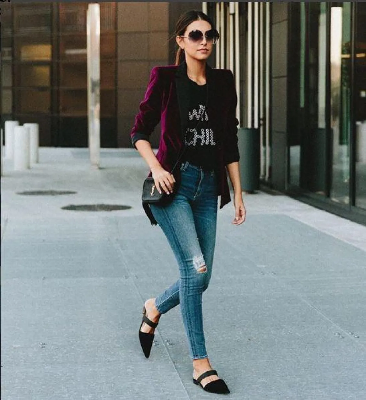 الجاكيت النبيذي مع الجينز والصندل المفتوح