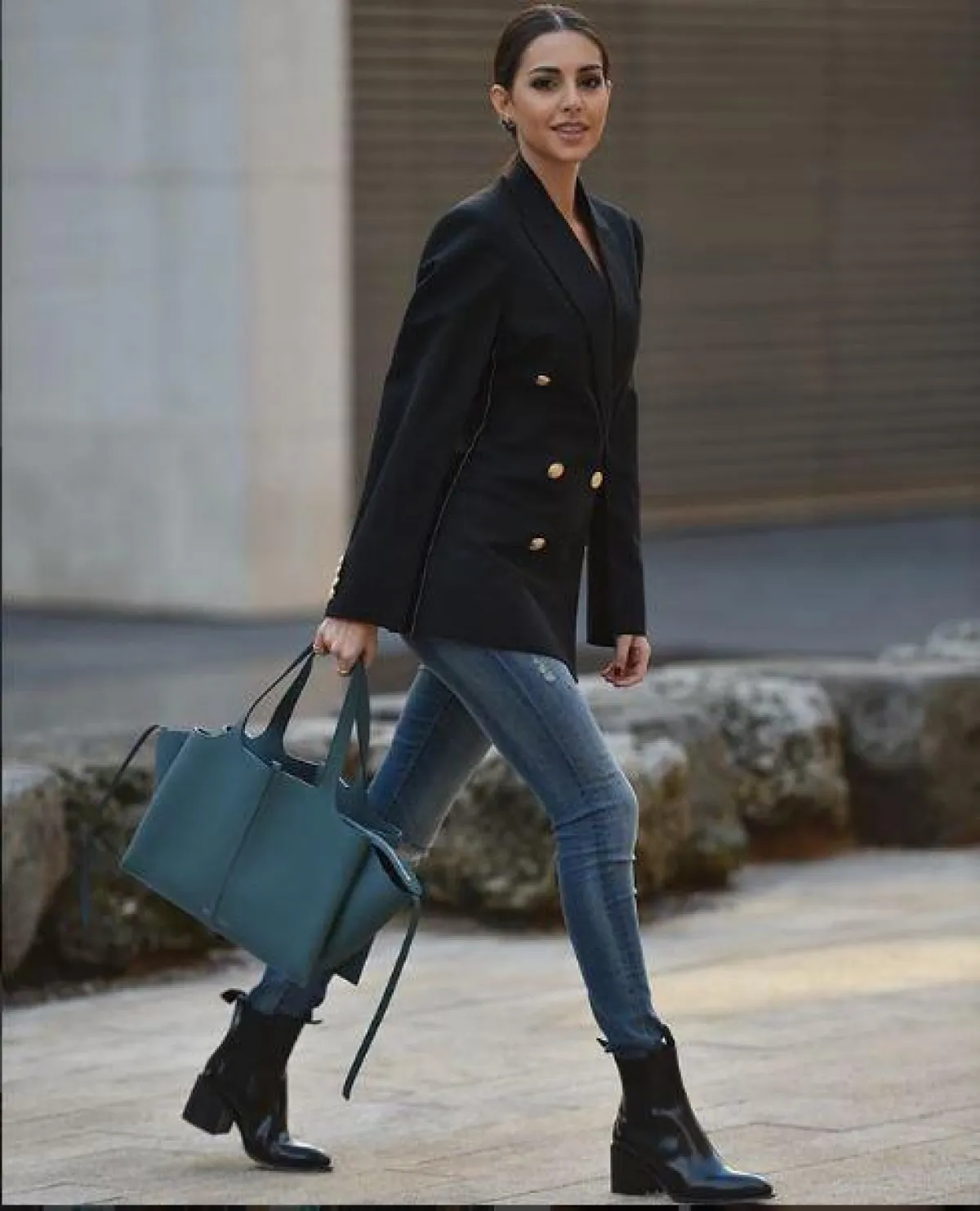 أما عن الكاجوال، فلاحظنا أن فاليري لا تميل كثيرًا إلى البساطة في تنسيقها للجينز على سبيل المثال، فهي تختار معه بلايزر كلاسيك لمناسباتها النهارية مع حذاء الكاحل أو البوت العالي الساق.