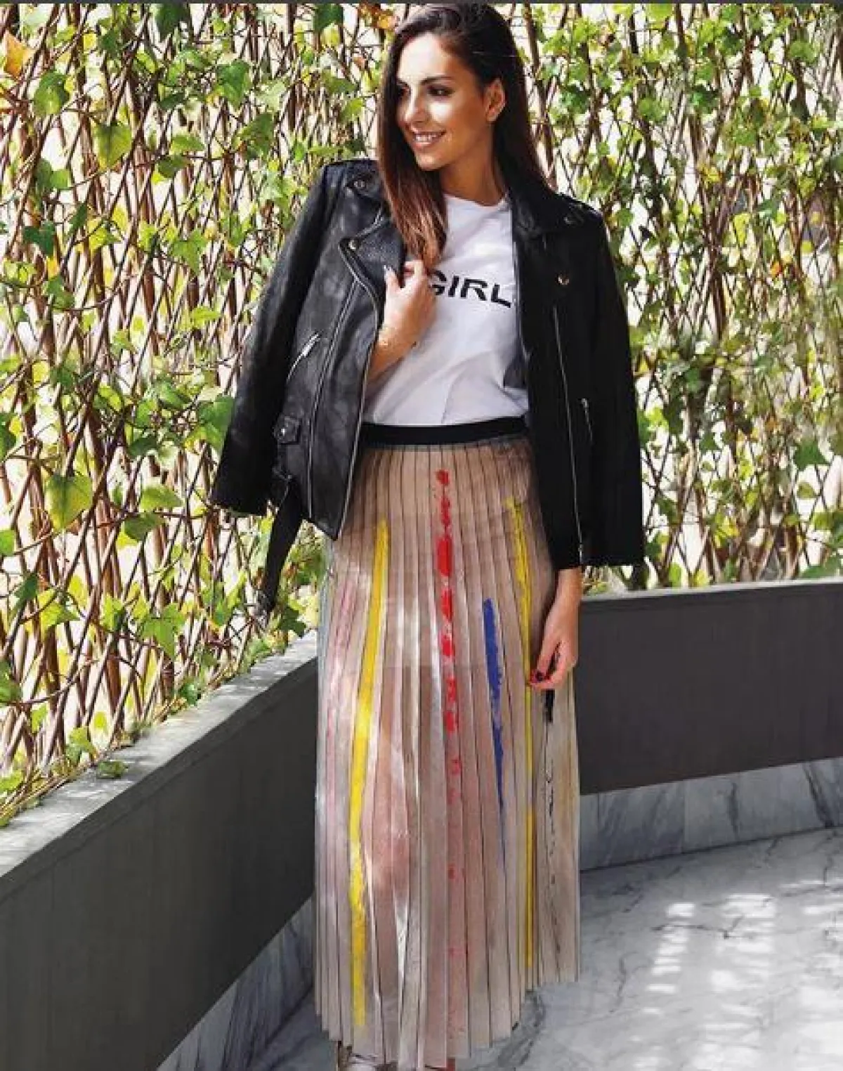 لفتنا تنسيق فاليري للـ تنورة البليسيه الشفافة بدرجات الروز، مع التيشرت الأبيض، واختارت وضع الجاكيت دون ارتدائه بشكل كام، لإطلالة متكاملة للعشاء مع الأصدقاء، أو مناسبة نهارية مهمة.