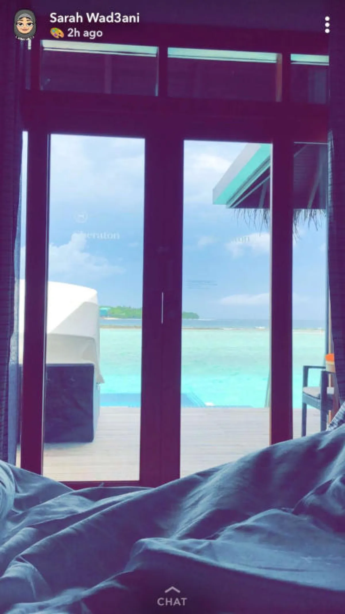 سارة الودعاني التي نشرت الصورة عبر حسابها على "سناب شات"، لم تُظهر وجهها أو وجه زوجها، بل اكتفت بالتركيز على التقاط صورة تظهر جزءًا من السرير في غرفة نومها المطلة على الشاطئ.