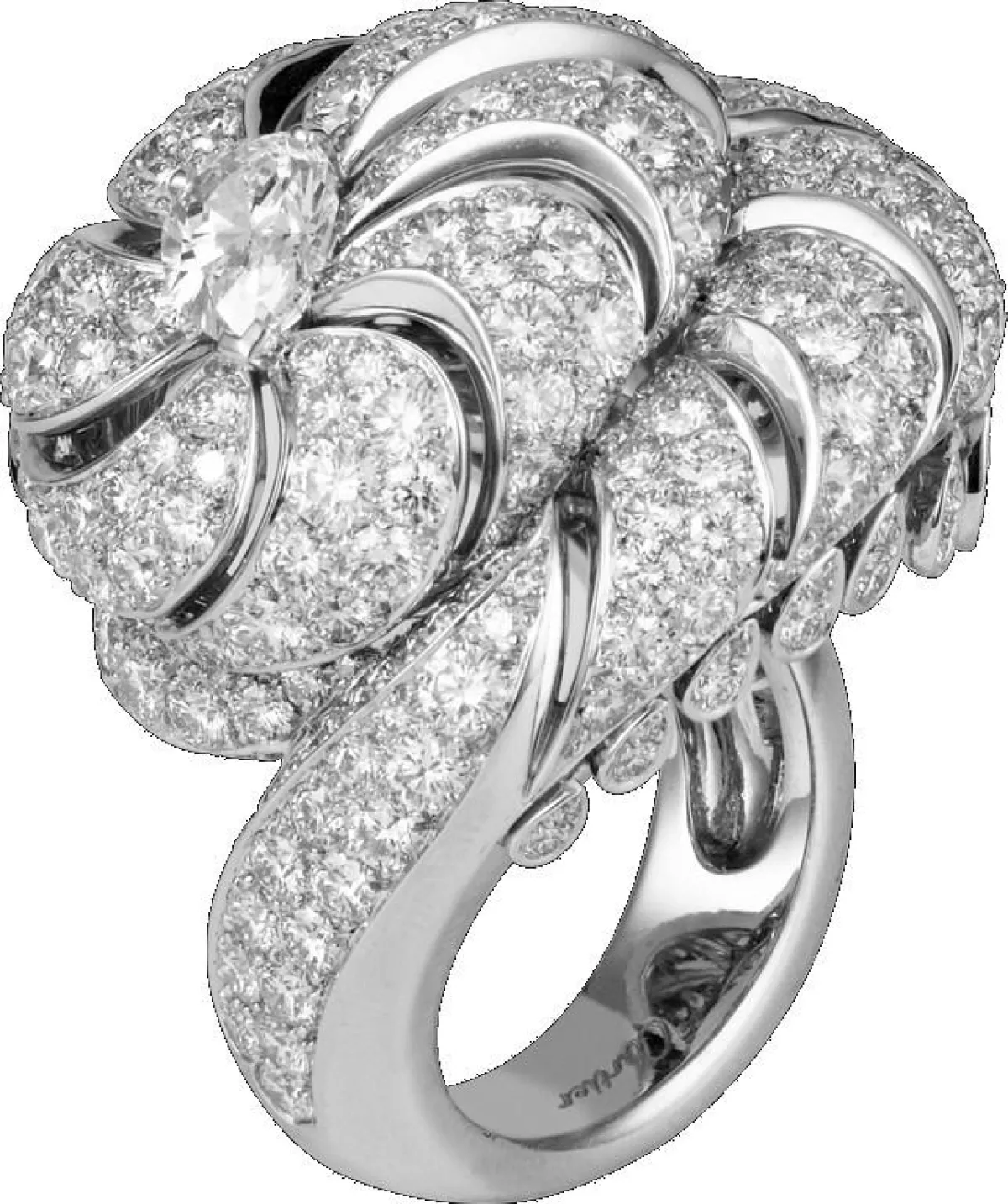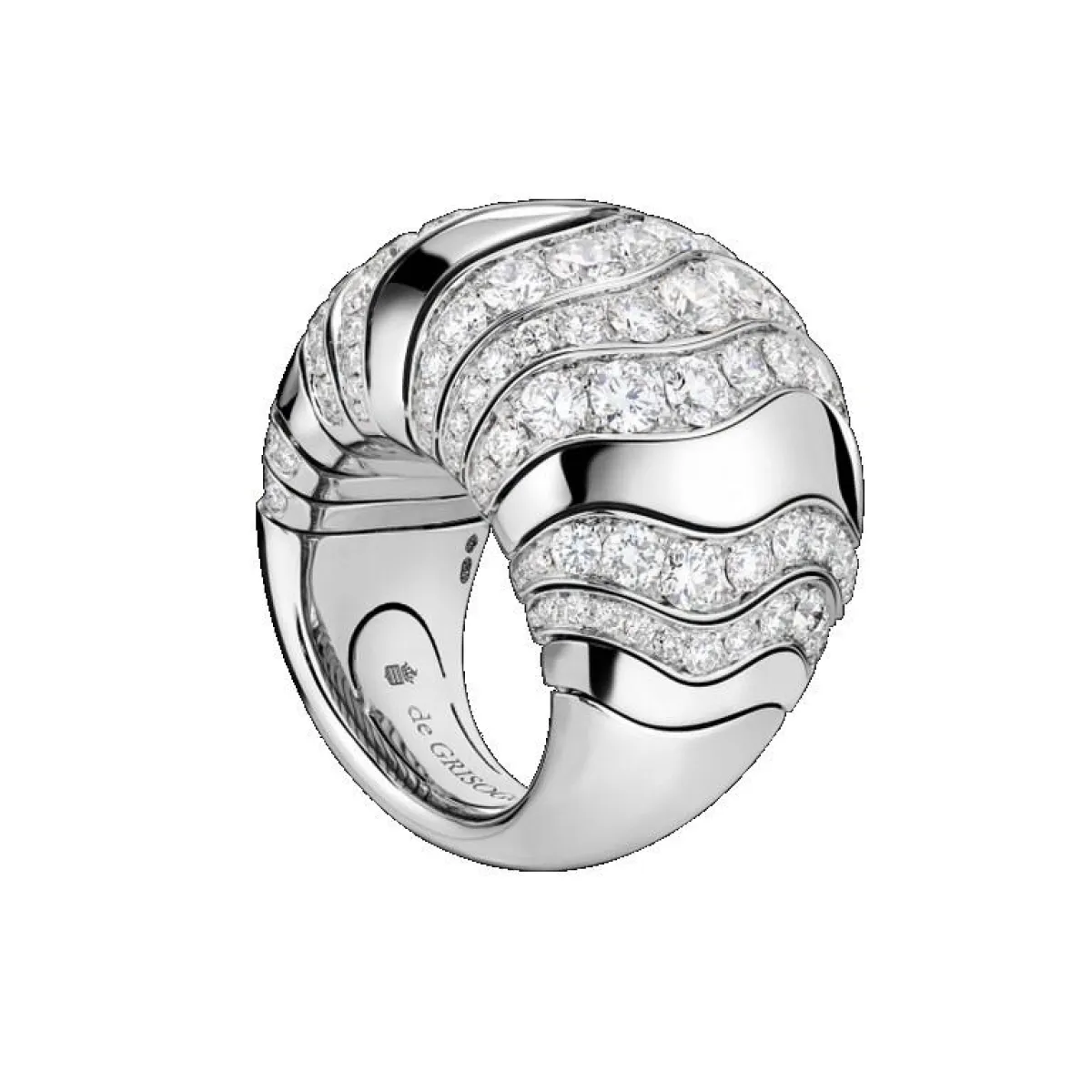 أما دار دي غريزوغونو de GRISOGONO التي عوّدتنا على تصاميمها الغريبة والمعقّدة، فقد أبهرتنا بهذا الخاتم من مجموعة ميليفوغلي Millefgolie والمصنوع من الذهب الأبيض عيار 18 قيراطاً ومرصع بحبيبات الماس البرّاقة.
