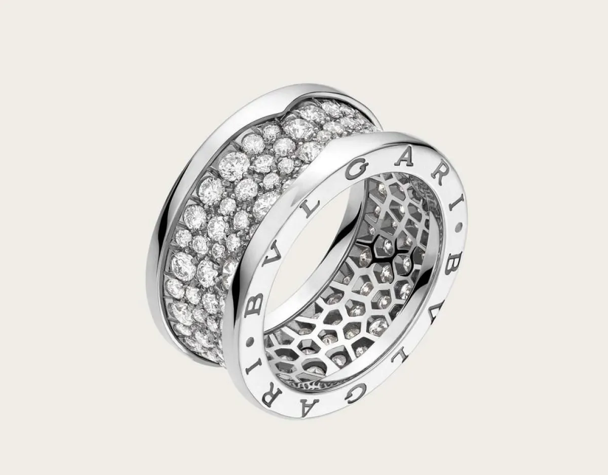 ولا ننىس بالطبع مجموعة خواتم بي زيرو وان B.Zero1 التي قدّمتها دار بولغري Bulgari وحصدت من خلالها الكثير من النجاح، ومن هذه المجموعة اخترنا هذا الخاتم المصنوع من الذهب الأبيض والمرصّع بأحجار الماس المتلألئة.
