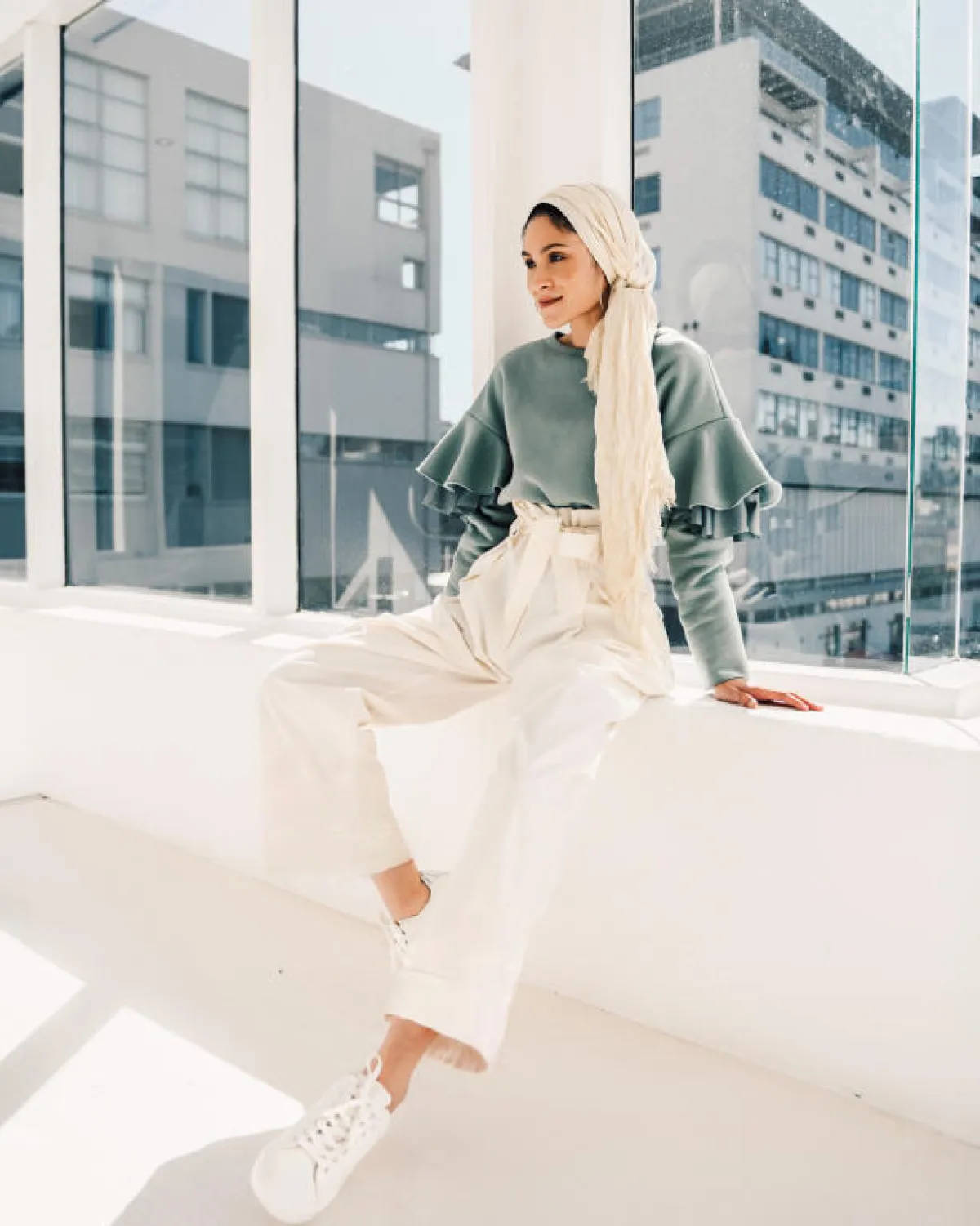 ليس شرطاً على الإطلاق أن تضمي جميع أطراف الحجاب فوق رأسك في لفة التوربان، بل بإمكانك ترك طرفه طويلاً بحيث تضعينه في حزام الخصر (إذا كنت ترتدين فستاناً على سبيل المثال).