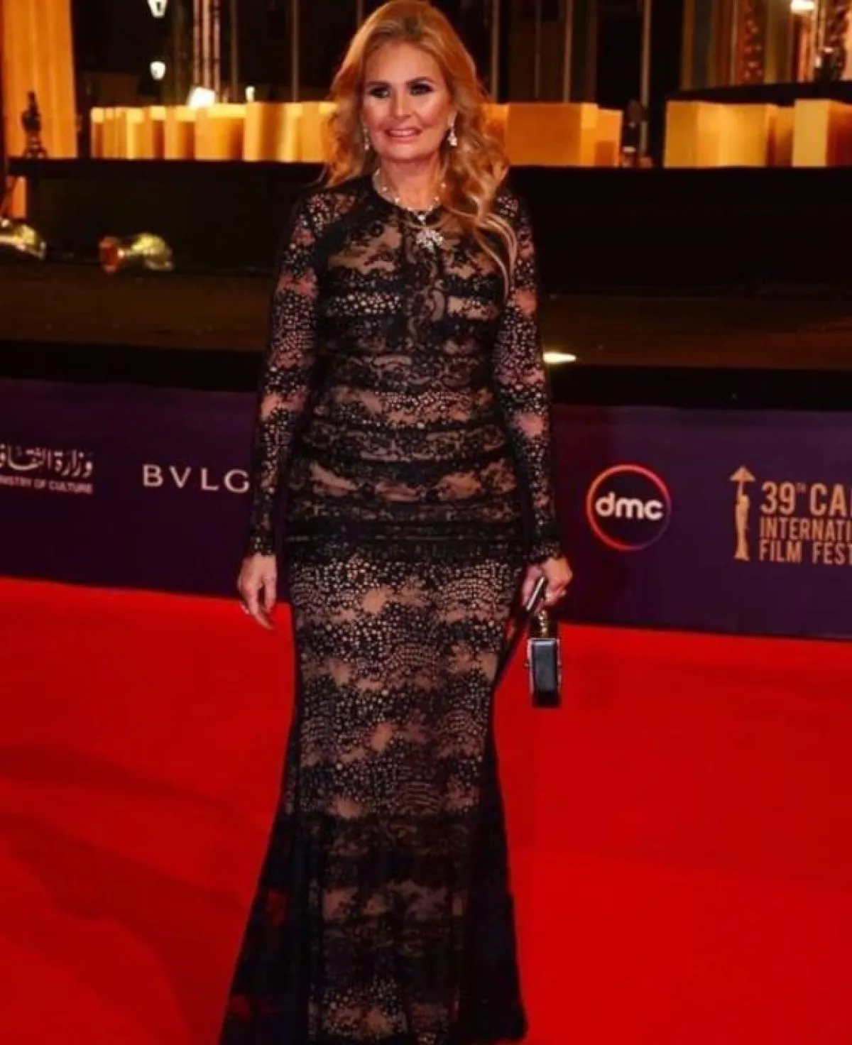 لفتنا اختيار النجمة التونسية درة فستانًا أسود من توقيع اللبنانية العالمية ريم عكرا Reem Acra، بتصميم الميرماد، مطرزًا شفافًا من ناحية الصدر والبطن.
