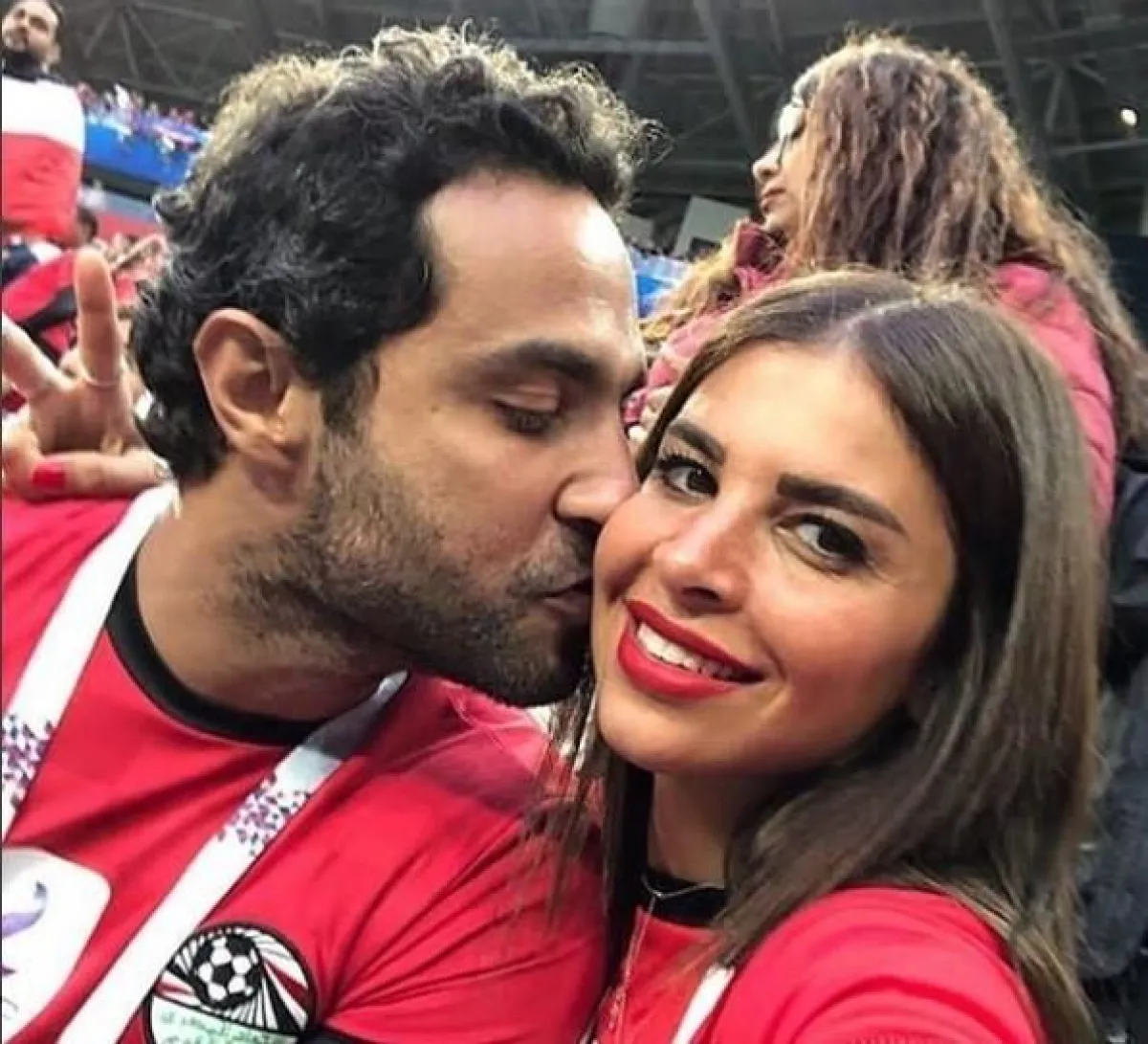 تداول عدد من رواد مواقع التواصل الاجتماعي صورة للفنان الشاب كريم فهمي وهو يقبّل زوجته في مدرجات احد مباريات كأس العالم المقامة حالياً في روسيا، خلال تواجدهما مع الوفد المصري الذي سافر لتشجيع المنتخب الوطني في المونديال.