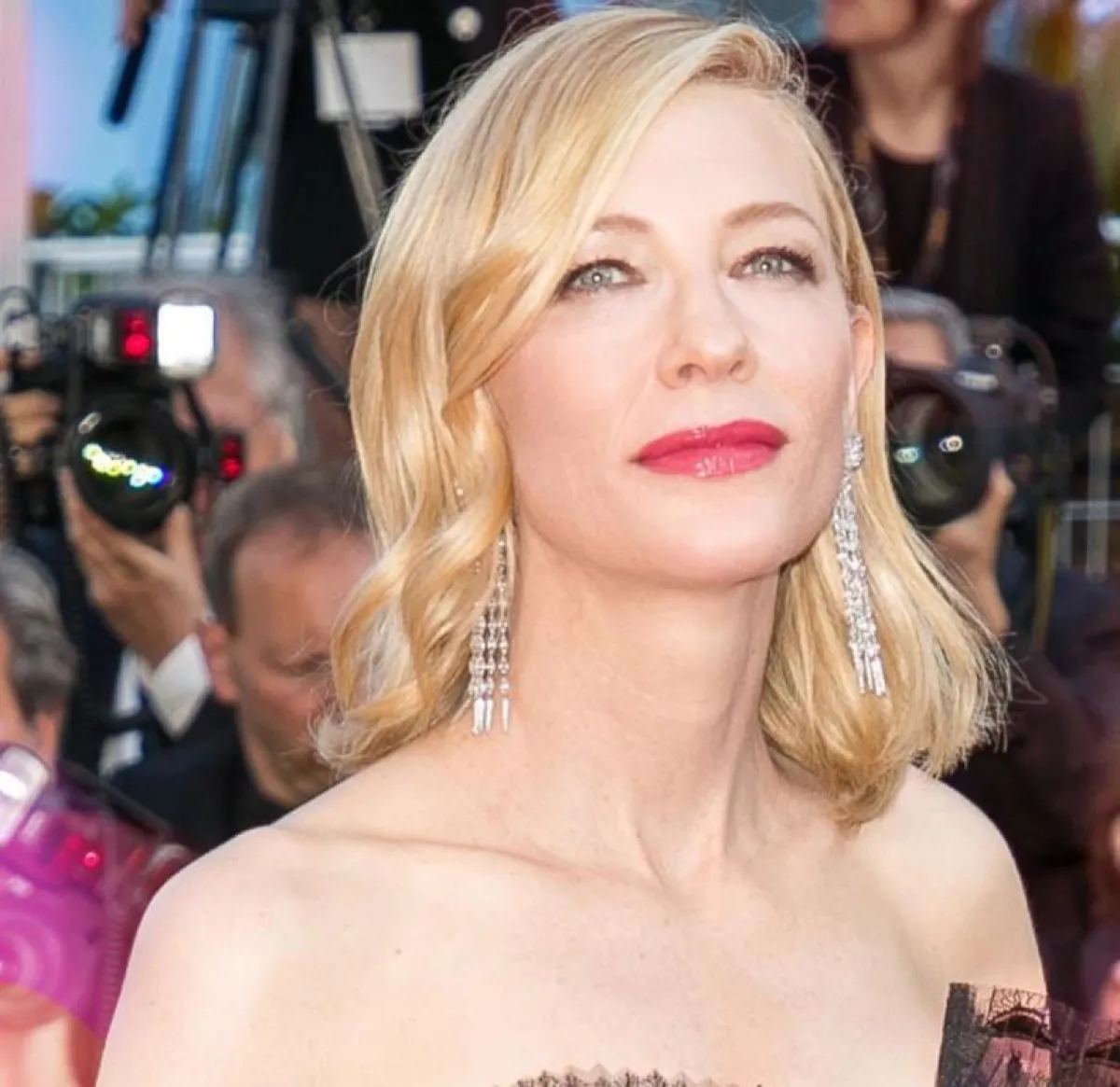 ومن الإطلالات اللافتة أيضاً كانت إطلالة كايت بلانشيت Cate Blanchett التي ترأست هذا العام لجنة مهرجان كان وحضرت في أحد أيام المهرجان بجمبسوت من جيفنشي Givenchy اختارت له أقراطاً متدلية من الألماس من توقيع دار شوبارد Chopard.
