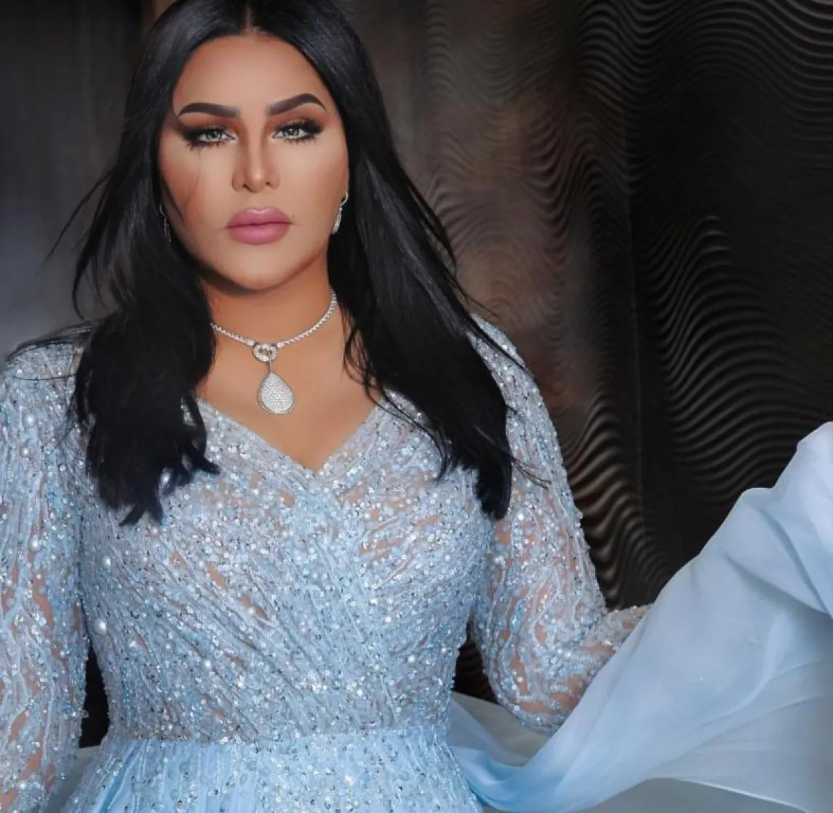 ومن بين الإطلالات الفاتنة التي سحرت أنظار المشاهدين، كانت إطلالتها بفستان أزرق مرصّع بحبيبات الباييت البرّاقة من زهير مراد والذي اختارت له عقداً من الذهب الأبيض والألماس بدا متناسباً جداً مع ياقة الفستان المنخفضة بعض الشيء.