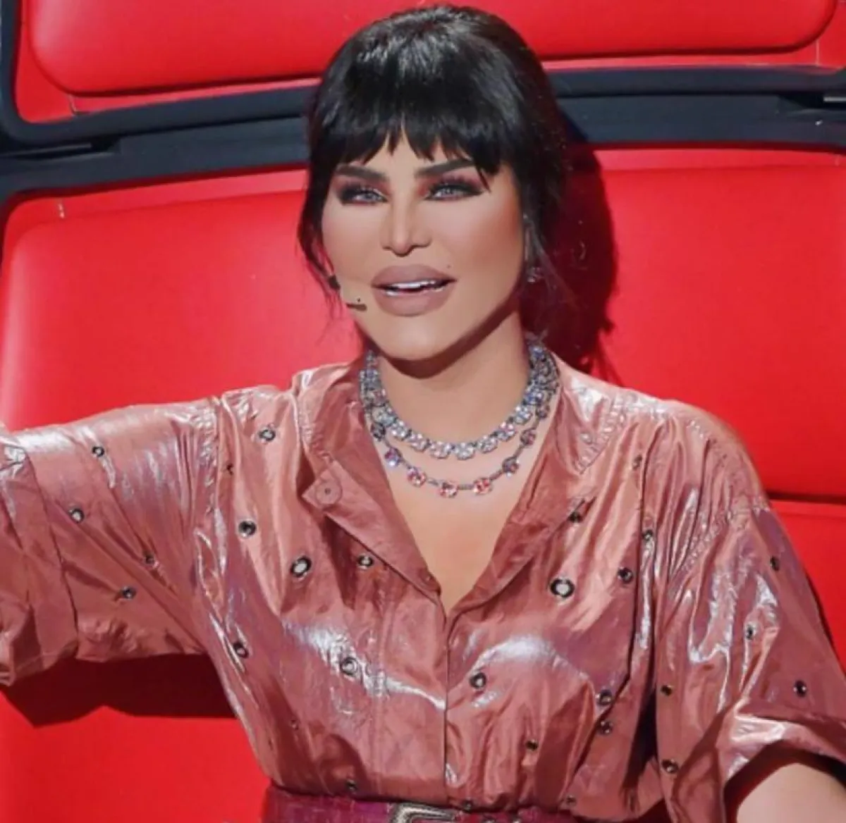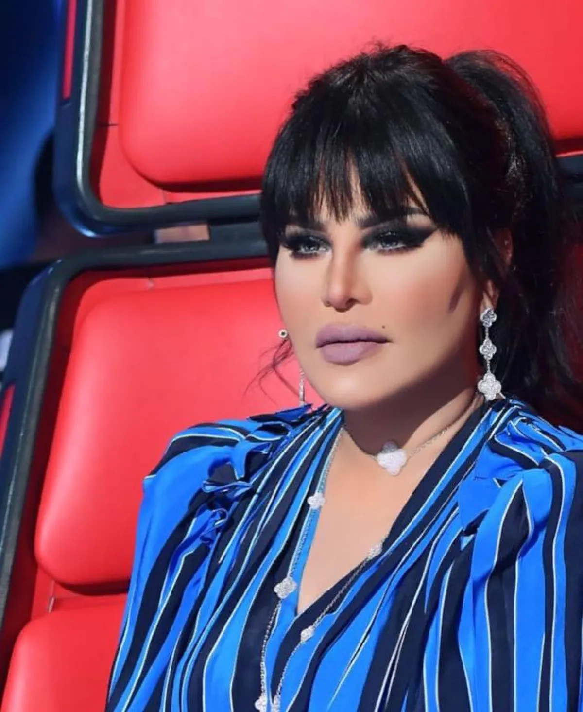 وفي ذا فويس أيضاً، أطلّت أحلام بزيّ أزرق مقلّم من توقيع دار جيفنشي Givenchy زيّنته بطقم مجوهرات مرصّع بالألماس من فان كليف أند أربلز Van Cleef&Arpels وتحديداً من مجموعة ألهامبرا Alhambra، منح الإطلالة لمسة إشراق مميّزة.