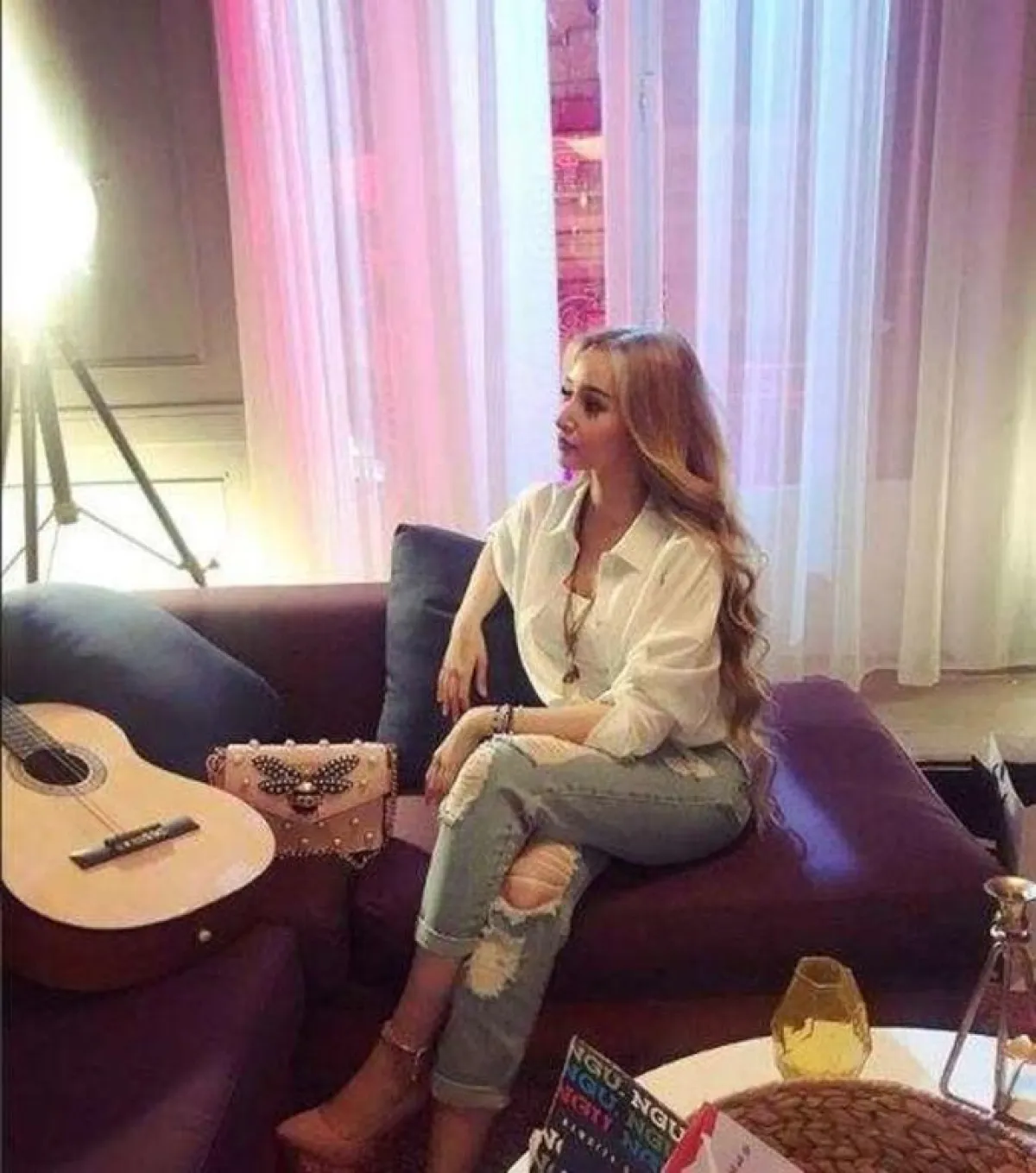 لفتتنا إطلالة الفنانة الشابة هنا الزاهد بالجينز الواسع باللون الثلجي الفاتح مع القميص الأبيض، والكعب العالي باللون النيود، وزينت الإطلالة بعقد كلاسيكي، مع حقيبة بنفس اللون النيود من غوتشي Gucci.