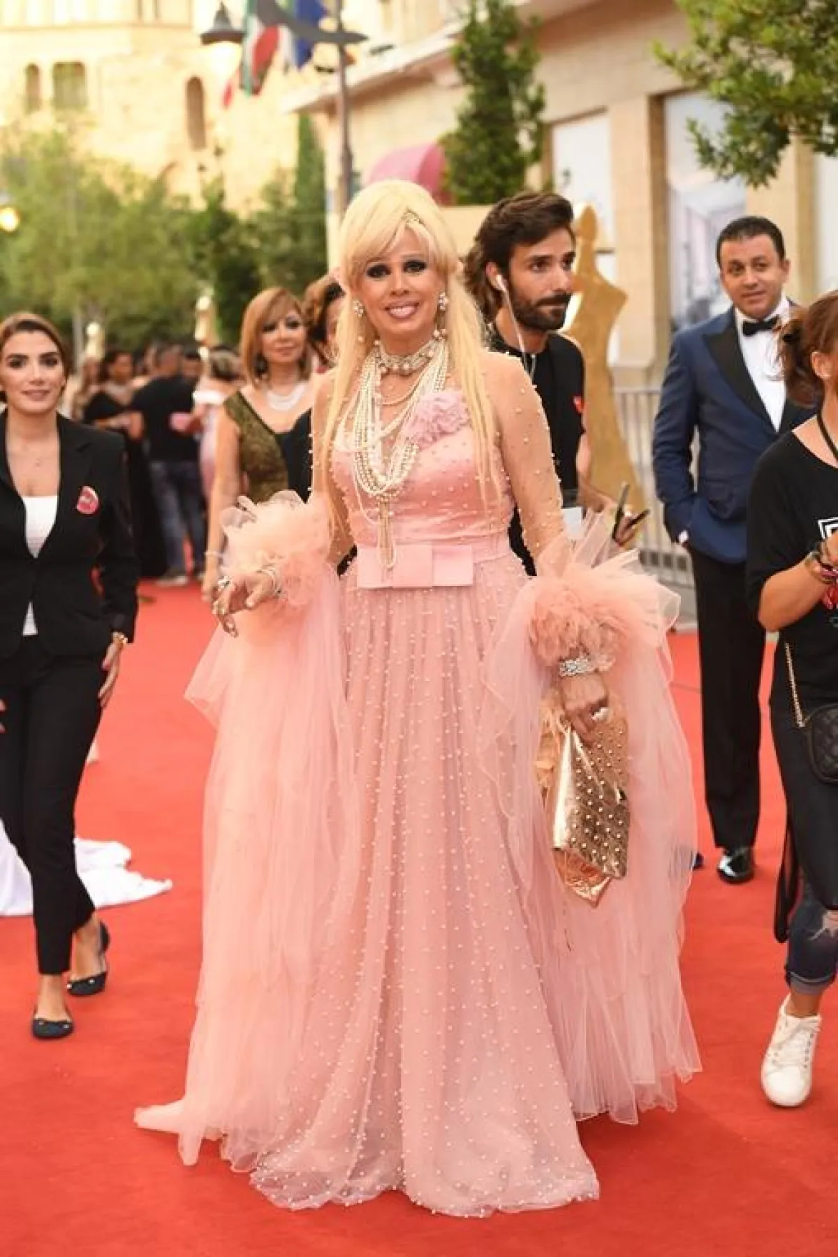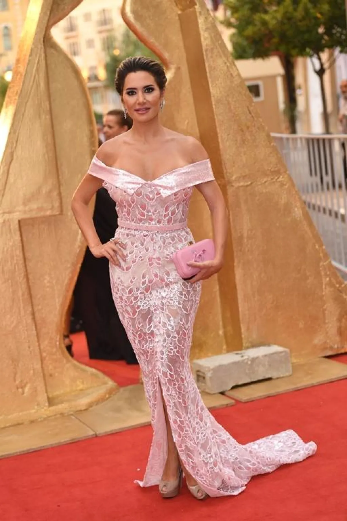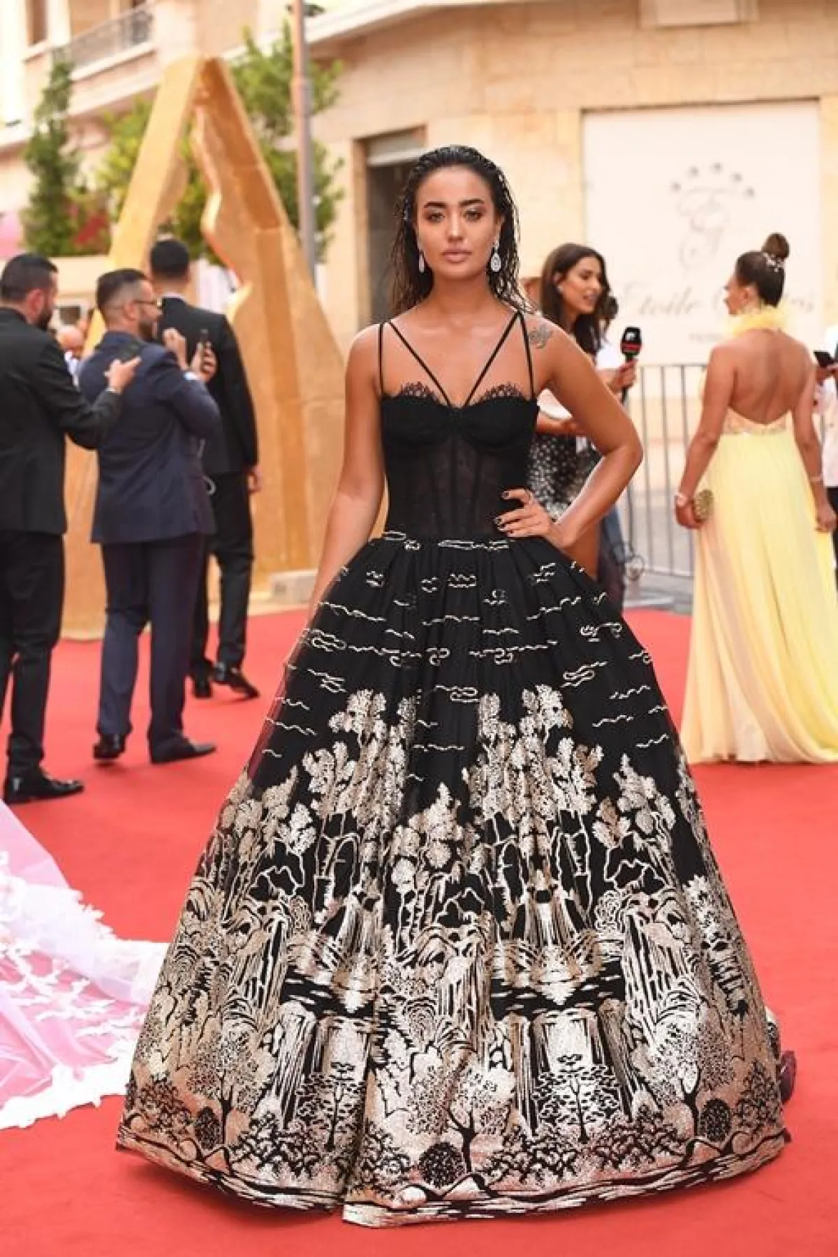 أيضاً النجمة اللبنانية ستيفاني صليبا وصلت الحفل بإطلالة ذهبية ملفتة وتسريحة شعر الكعكة التي زادت من جمالها وتألقها.