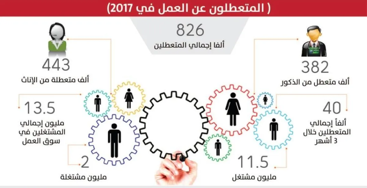 وأبان تقرير هيئة الإحصاء أيضاً، أن عدد العاطلين من الذكور بلغ أكثر من 382 ألف، فيما إجمالي عدد العاطلين أكثر من 826 ألف.