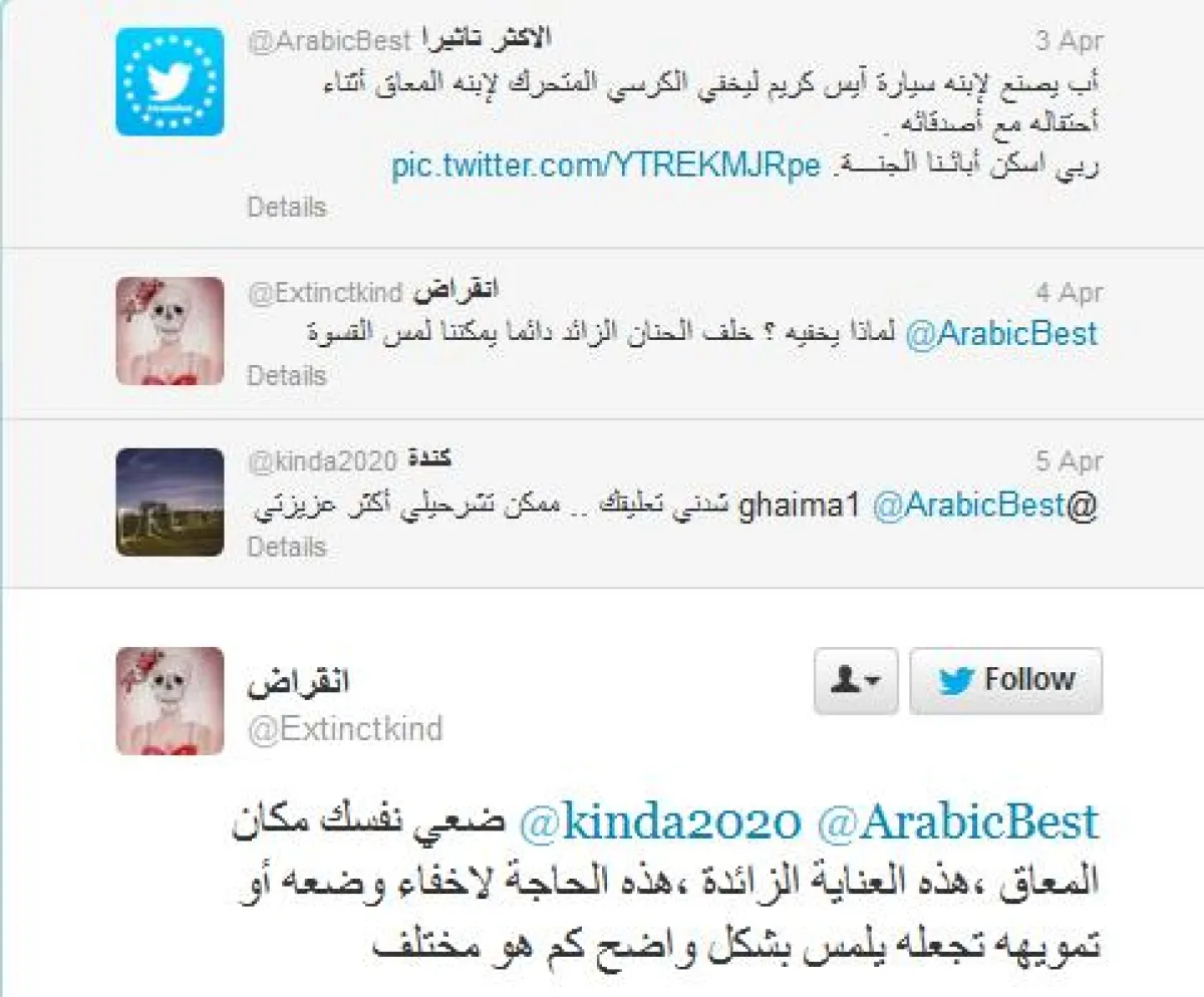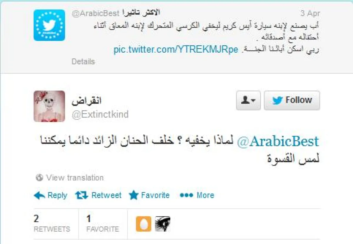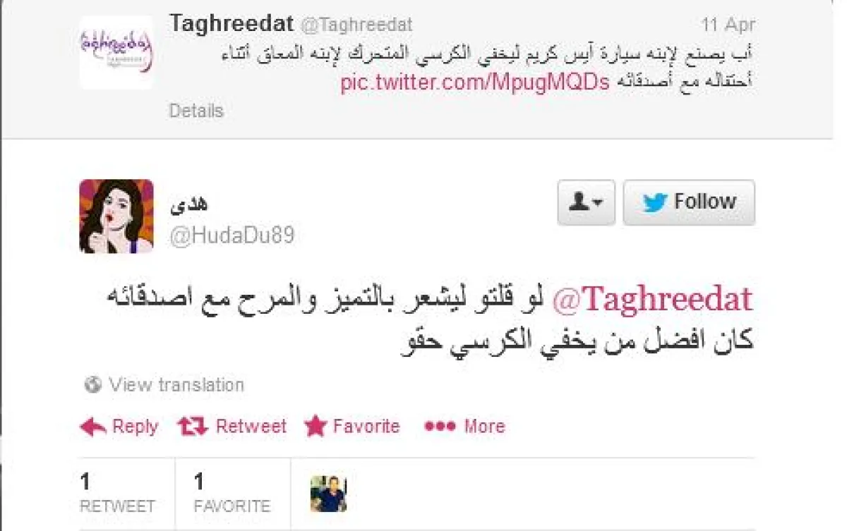 و قالت هَـ❢‏@ii_HYON: "أنا أحس هالاب مخطئ بهذي الحركة ليش يخفي إعاقة ابنه الاعاقه ابتلاء من ربي مب عيب بيكبر الابن ويكبر معه شعور انه لازم يخفي اعاقته"أما انقراض ‏@Extinctkind فكانت ضد الفكرة، وقالت:"لماذا يخفيه ؟ خلف الحنان الزائد دائما يمكننا لمس القسوة، ضعي نفسك مكان المعاق ،هذه العناية الزائدة ،هذه الحاجة لإخفاء وضعه أو تمويهه تجعله يلمس بشكل واضح كم هو مختلف"وكانت مشكلة هدى ‏@HudaDu89 مع الجملة المعبِّرة تحت الصورة، حيث قالت:"لو قلتو ليشعر بالتميز والمرح مع اصدقائه كان افضل من يخفي الكرسي حقو".