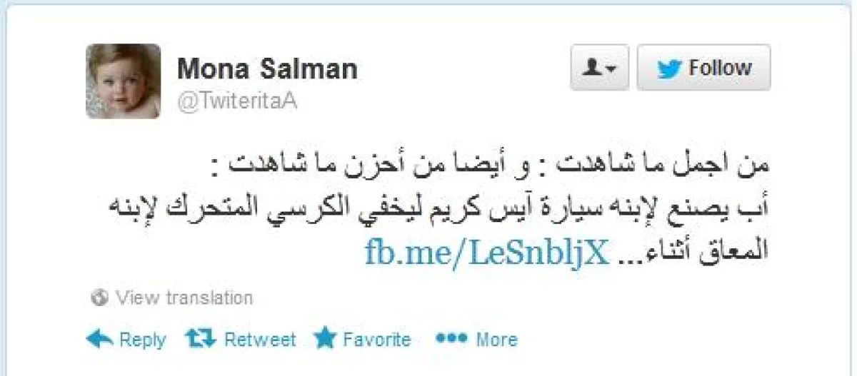 تداول مغردو موقع التواصل الاجتماعي "تويتر" صورة معبِّرة لأب محب استطاع أن يشعر ابنه المعاق بالتمييز، وذلك بأن صنع له سيارة "آيس كريم" للاحتفال بها، وتقول التغريدة: "أب يصنع لابنه سيارة آيس كريم ليخفي الكرسي المتحرك لابنه المعاق أثناء احتفاله مع أصدقائه".