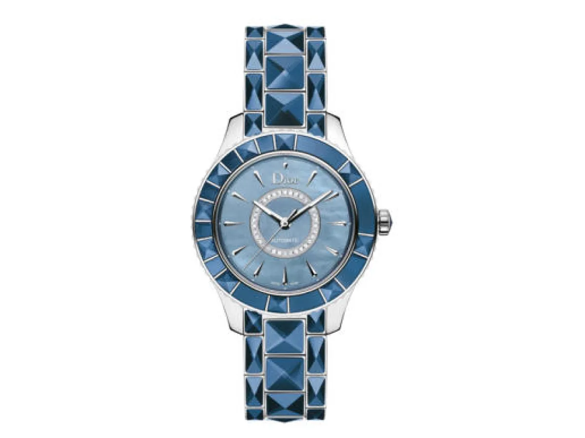 نقدم لك ساعة "دنيم سبيريت" Denim Spirit الجديدة من مجموعة ديور كريستال Dior Christal من "ديور تايمبيسيز" Dior Timepieces باللون الأزرق الصافي. تتمتع هذه الساعة بمواصفات عالمية وتصميم أنيق، حيث رُصّع المينا بداخله بحلقة من الماس الأبيض، بينما تزين الإطار والسوار بحبات السافير الأزرق. وهي متوافرة بقياسين مختلفين: قيام 33 ملم يتميز بحركة كوارتز ذات الجودة العالية، وقيام 38 ملم بحركتها الأوتوماتيكية العملية. وتتميز ساعة "ديور كريستال" Dior Christal الزرقاء والمصنوعة من الفولاذ الصلب بأنها مقاومة للماء حتى عمق 50 متراً.