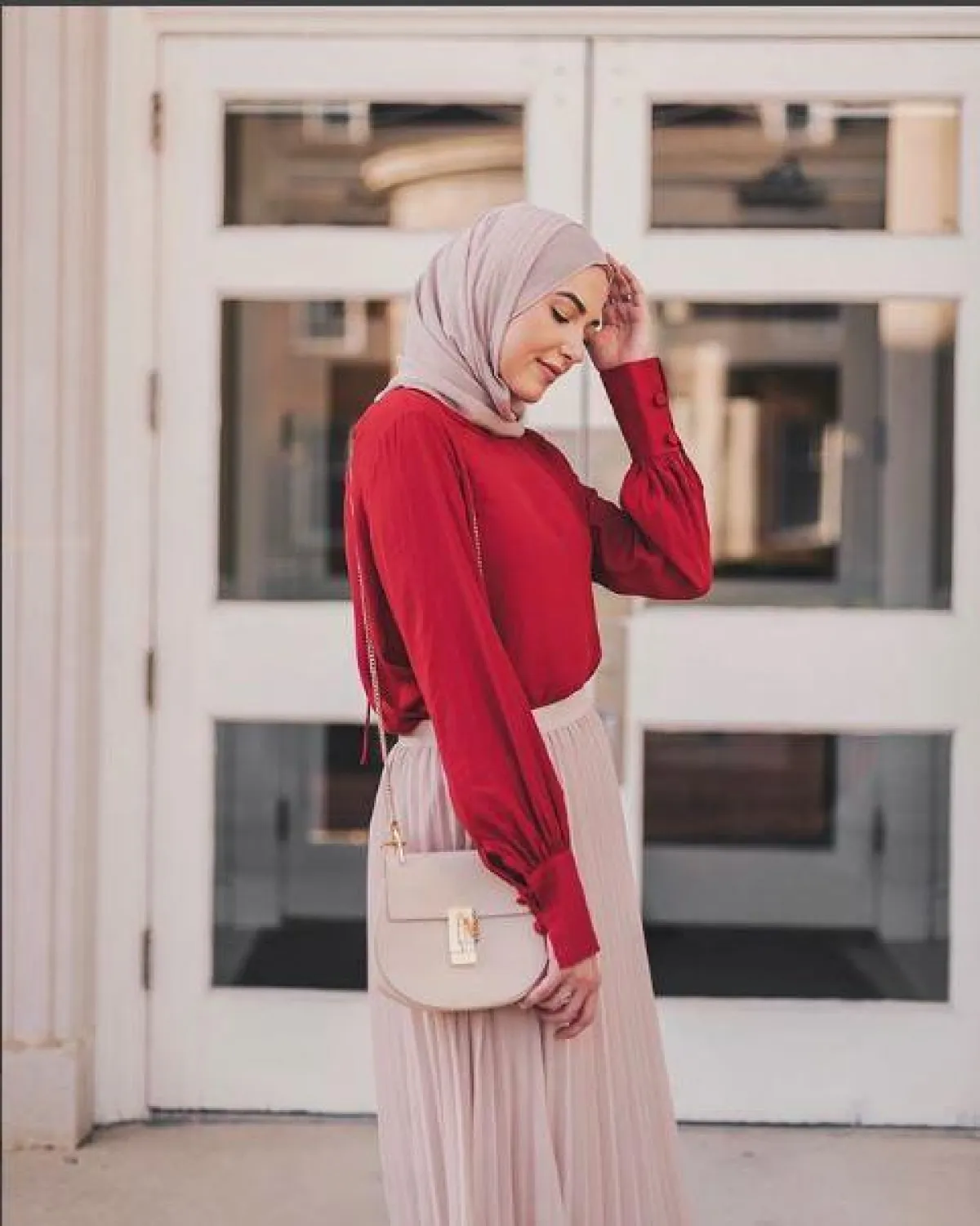 تستطيع لينا الأسعد دمج الألوان الجريئة بشكل ذكي للغاية، وخير مثال الإطلالة بـ التنورة المُتكسرة عالية الخصر باللون الروز الهادئ، مع بلوزة من الحرير الناعم باللون الأحمر الجريء، وحقيبة اليد الروز الصغيرة، وتبدو الإطلالة مناسبة أكثر لأوقات المساء، أو لسهرة بسيطة مع العائلة.