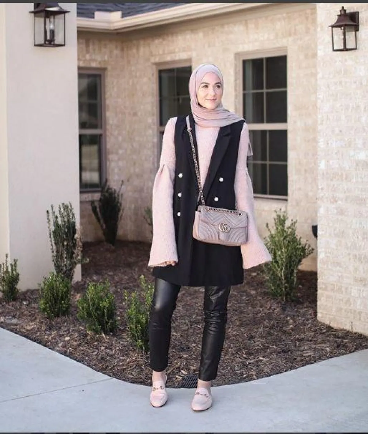 أو بـ البلايزر الكات، مع البلوزة الكلاسيكية واسعة الأكمام، والبنطلون الجلد الذي أضفى لمسة جريئة على الإطلالة الهادئة.