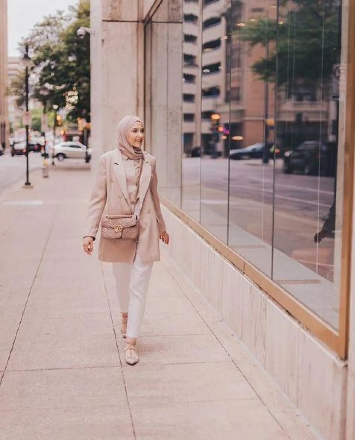 اتباع الصيحات العصرية الرائجة هذا العام جزء أساسي من ستايل أي مدونة للموضة، مثل اختيار لينا أسعد للبلايزر بأكثر من طريقة، كهذا التصميم بـ الأكمام الطويلة بلون الروز المائل إلى الترابي الذي يبدو مثاليًا للعمل مع البنطلون الأبيض، وحذاء أرضي من نفس اللون من دار أزياء valentino فالنتينو.