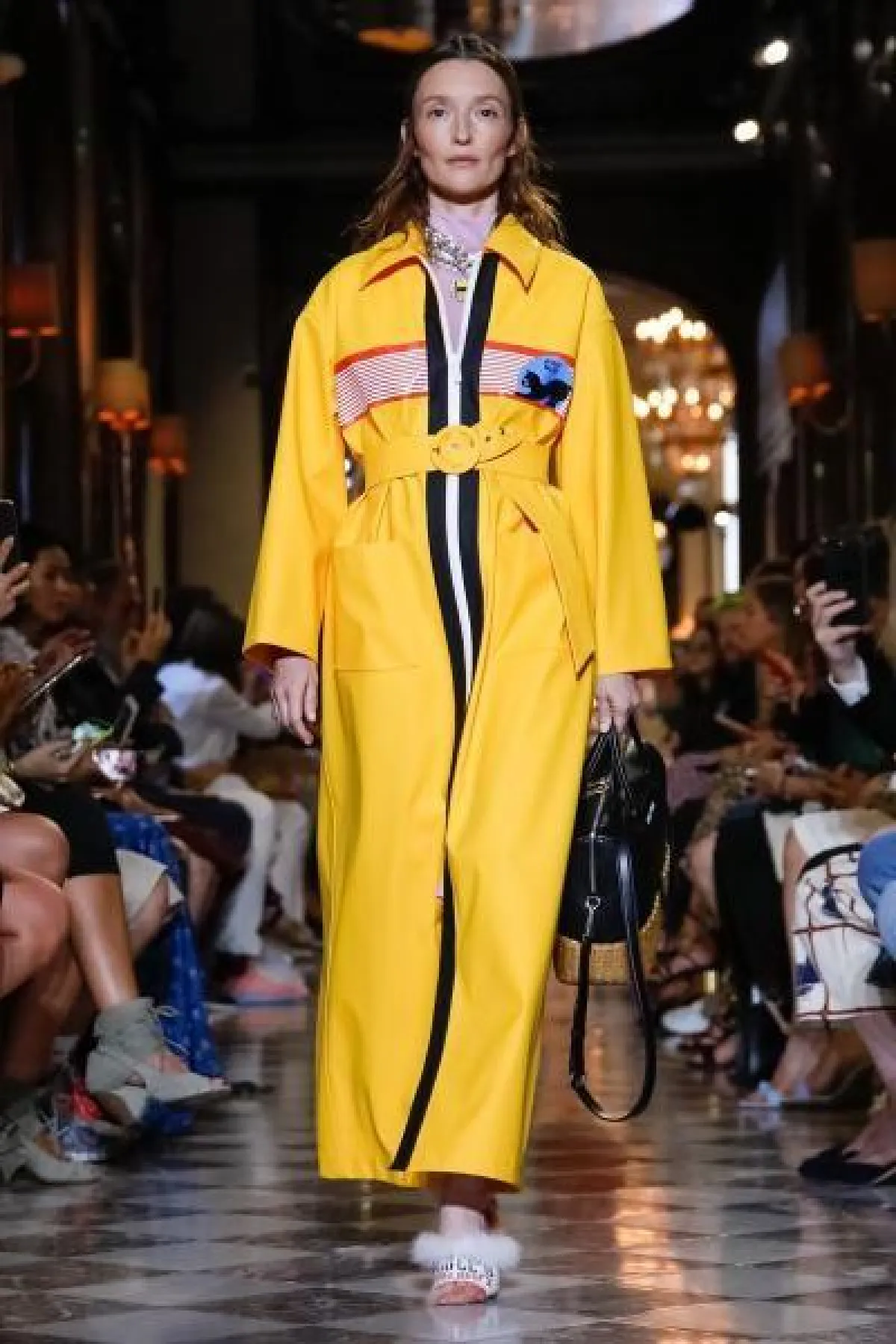 وإلى ماركة ميو ميو Miu Miu حيث المزيج الكلاسيكي العصري الذي ننتظره بشغف في كل موسم، حيث ستجدين ما يلائمك أيضاً وتصاميم محتشمة وعصرية من السترات الطويلة المفتوحة من الأمام، والتي يمكن تنسيقها مع أزياء متنوعة، فقدمت هذا الموديل باللون الأسود واللون الأصفر.