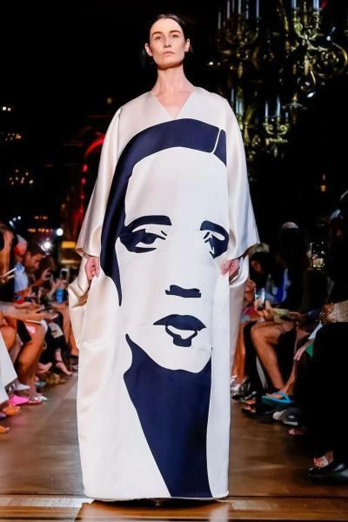 أيضاَ صممت ماركة Schiaparelli عباءة فضفاضة بقماش الستان الفاخر، ولفتت الأنظار بطبعة الوجه التي تزينها باللون الأزرق على خلفية باللون الأبيض.