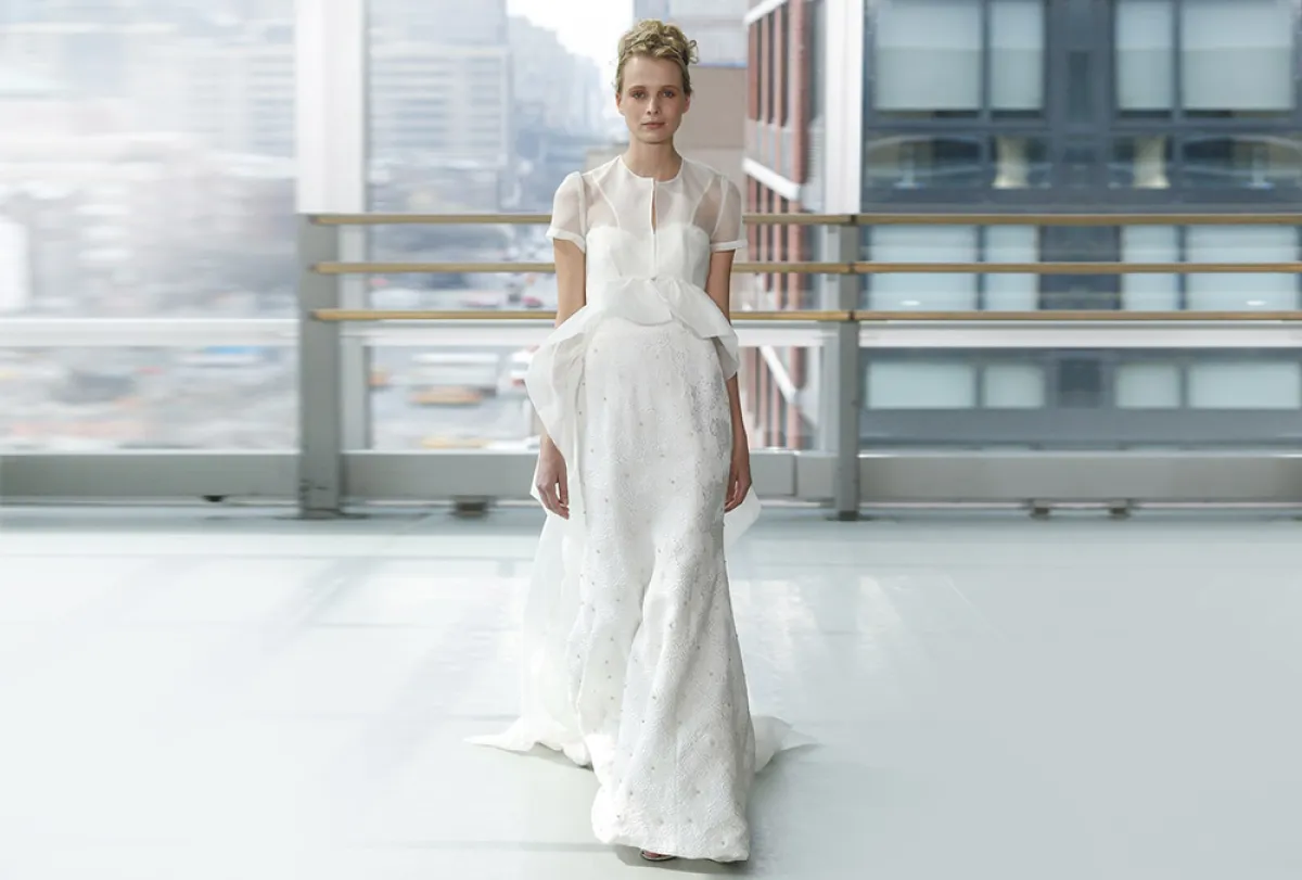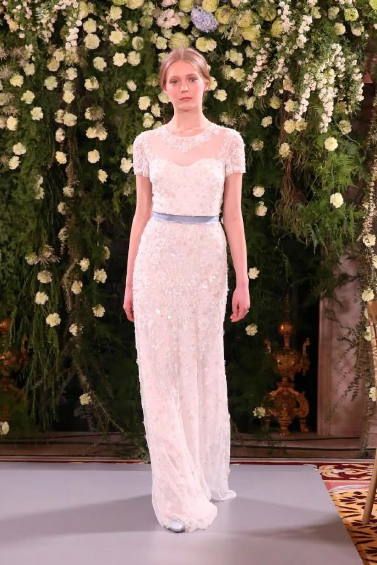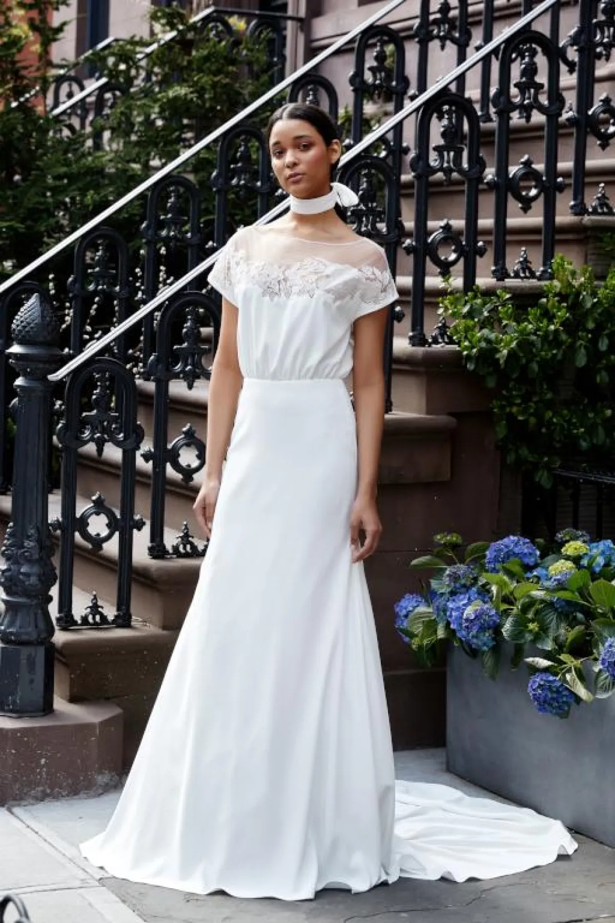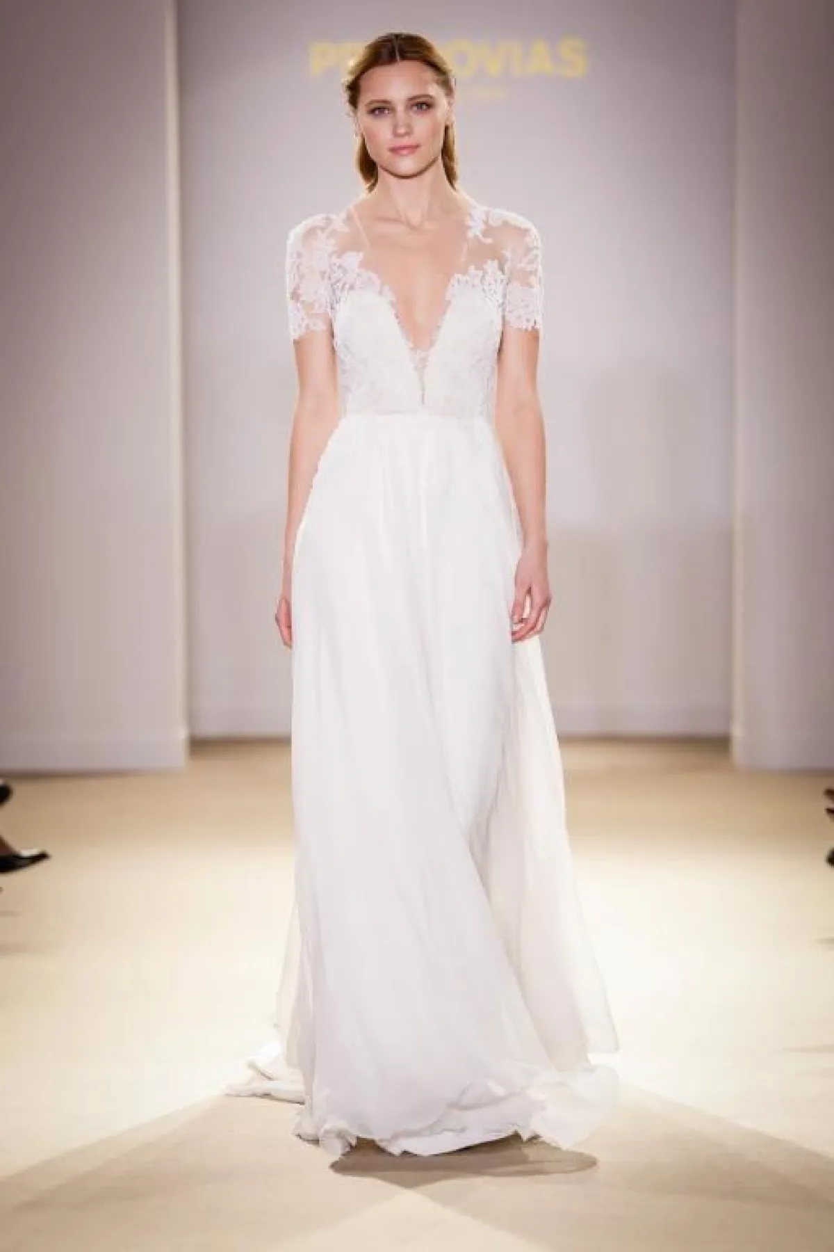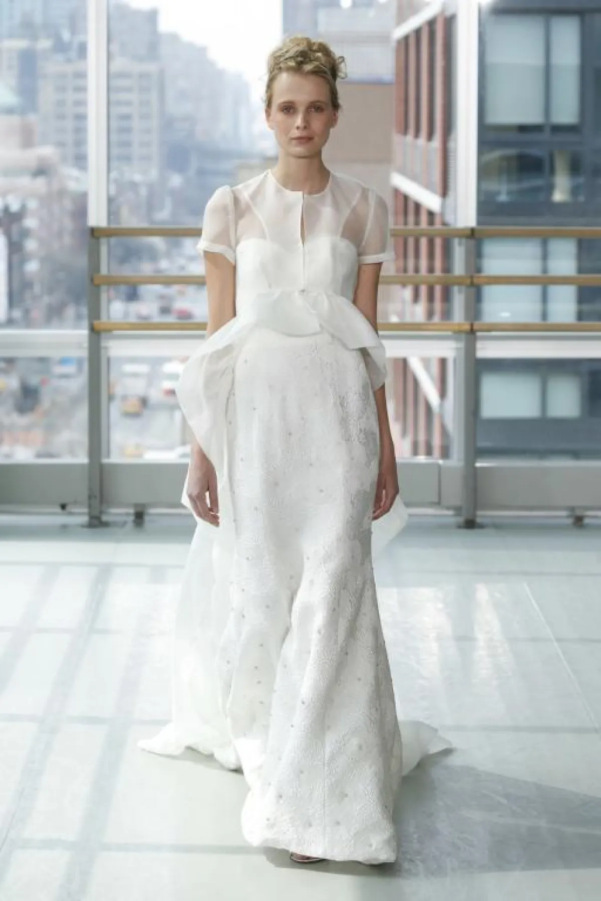 وغالبًا ما تكون فساتين الزفاف بالأكمام القصيرة مع قصّة عمودية Sheath أو واسعة قليلًا من أسفل، مثل فساتين زفاف ليلا روز Lela Rose، و Gracy Accad.