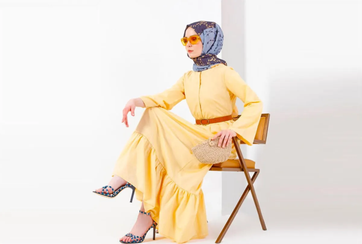 - اختاري فستاناً باللون الأصفر ونسقيه مع لفة حجاب منقوش، إن كنت تحتارين في لون الحجاب فبإمكانك اختيار لون الحجاب بدرجات اللون الأزرق وممزوجاً بقليل من اللون الأصفر، انتعلي أيضاً مع هذه الإطلالة حذاءً بكعب عالٍ باللون الأزرق سواء كان بلون موحد أو منقوش.