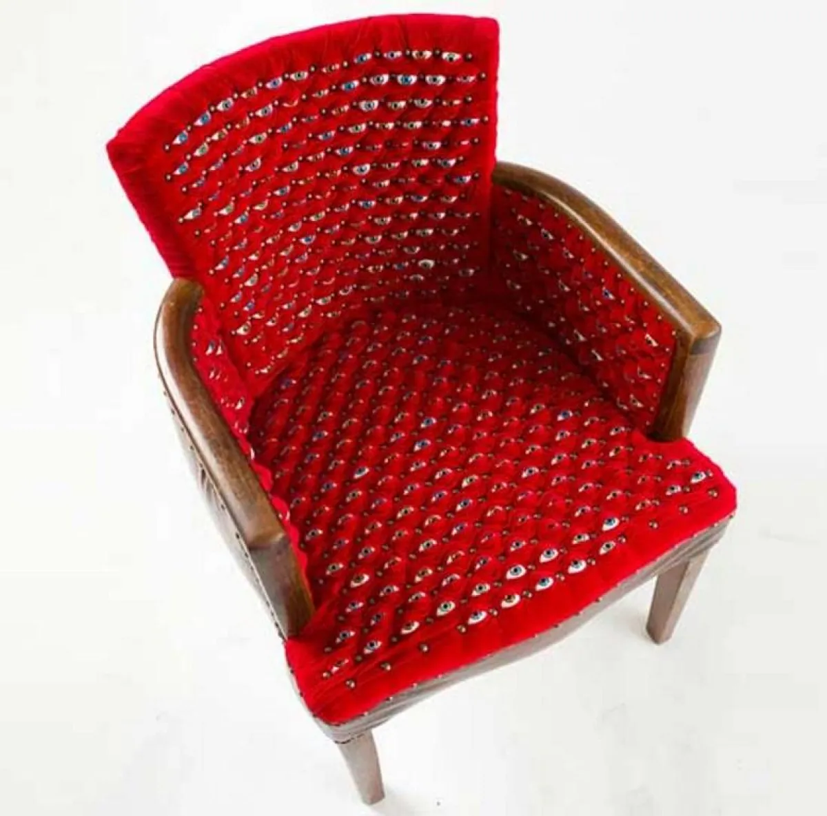كرسي مصنوع من العيون: صمّمته الفنّانة الأستراليّة "فيونا روبرتس" بهدف إراحة الجسد.وهو مشغول من القماش الأحمر، ومزدان بعدد من العيون المفتوحة متعدّدة الألوان.