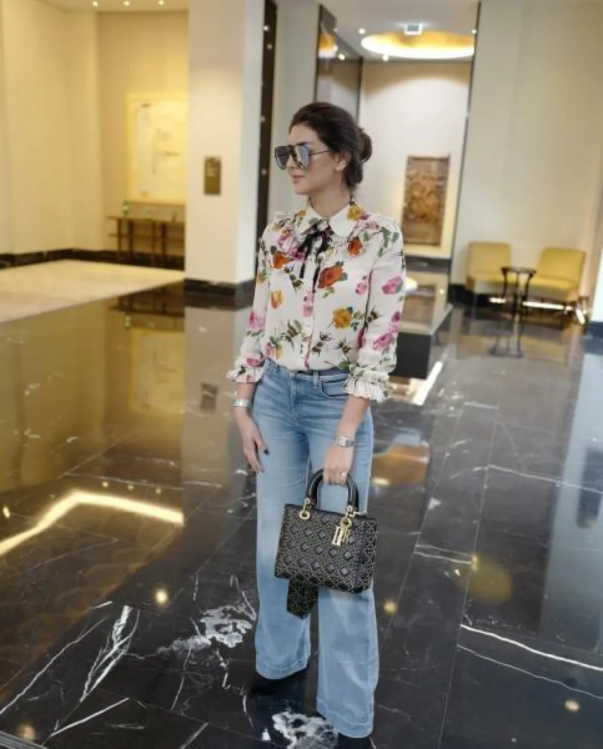 2-الأزياء المورّدة من فساتين، بلوزات وحتى تيشيرتات ستايل تعشقه الإعلامية الشهيرة، وتختاره دائمًا بطبعات صغيرة شديدة الرقة، حتى لا تُظهرها بقوام ممتلئ.