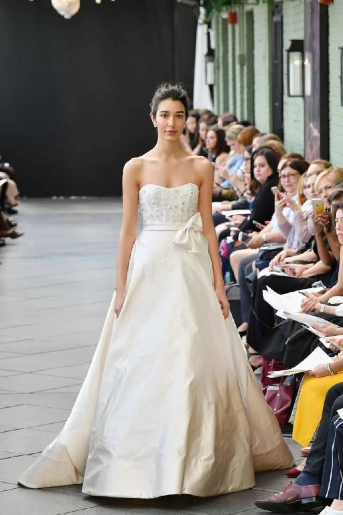 كما ظهر اللؤلؤ على بعض فساتين الزفاف الستان الراقية، ليضيف لمسة كلاسيكية إلى الفساتين، مثل فستان زفاف Jenny Yoo الحمّالات مع التنورة المنفوشة.
