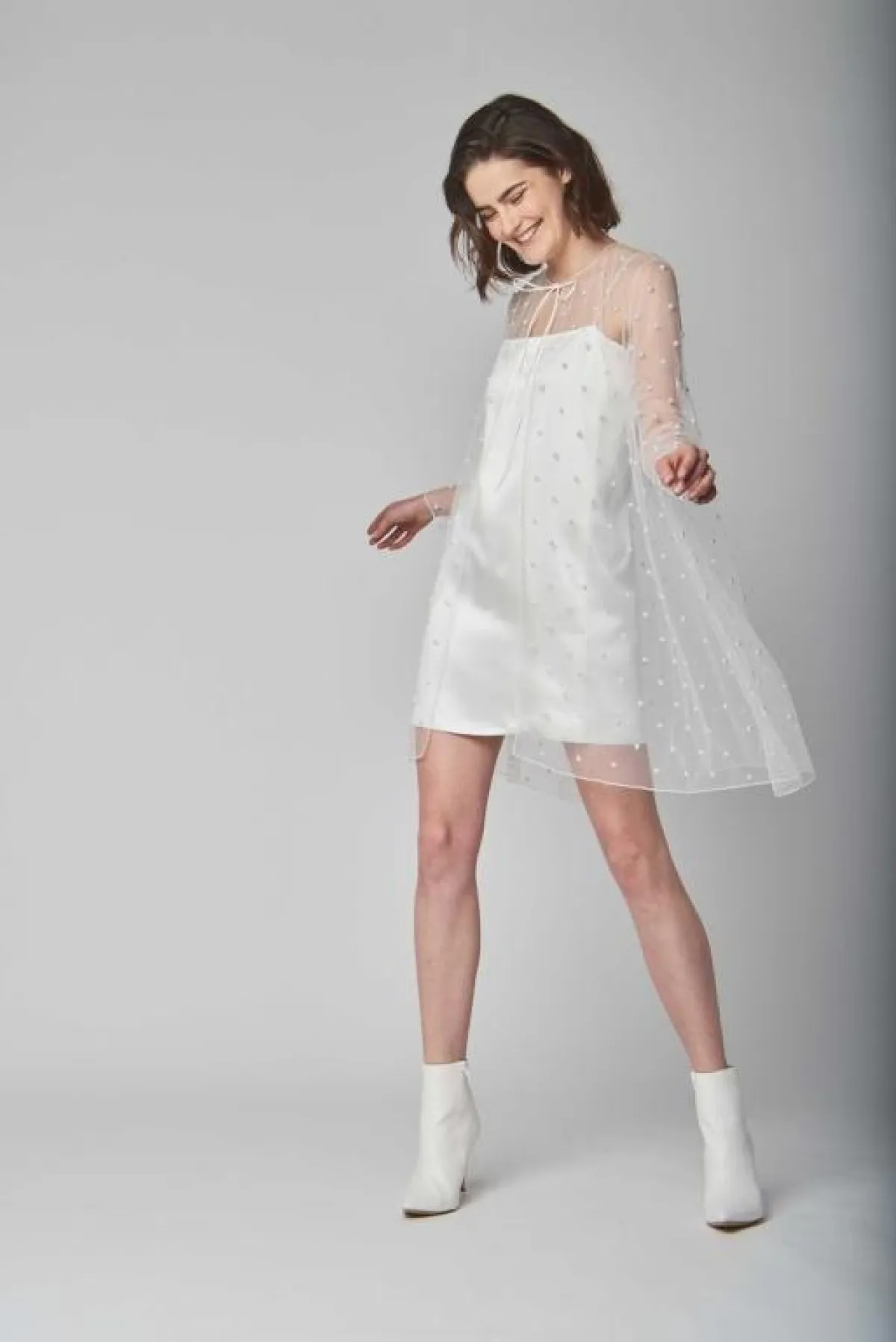 أيضًا تميز فستان زفاف Alexandra Grecco القصير بحبّات اللؤلؤ التي تزيّنه على السترة الشفّافة، ليناسب العروس العصرية.