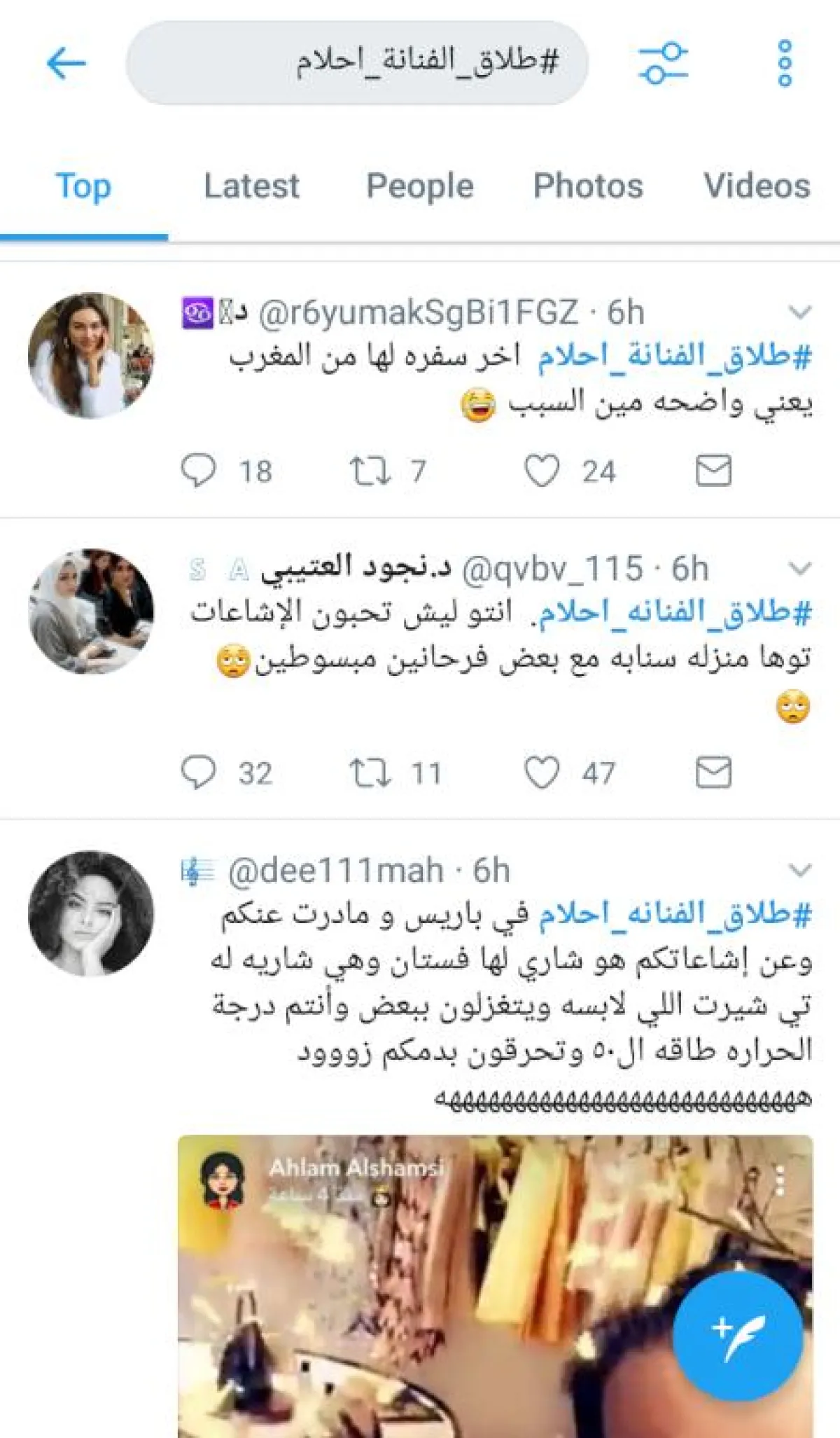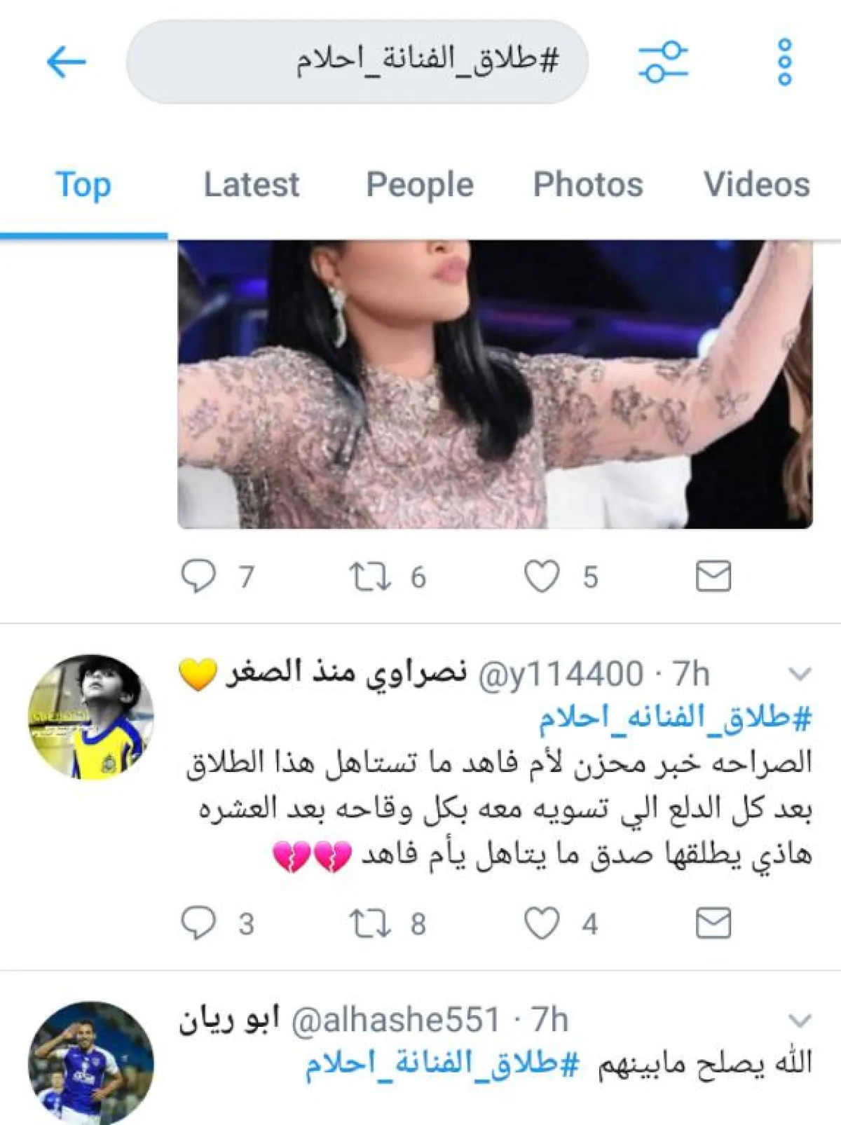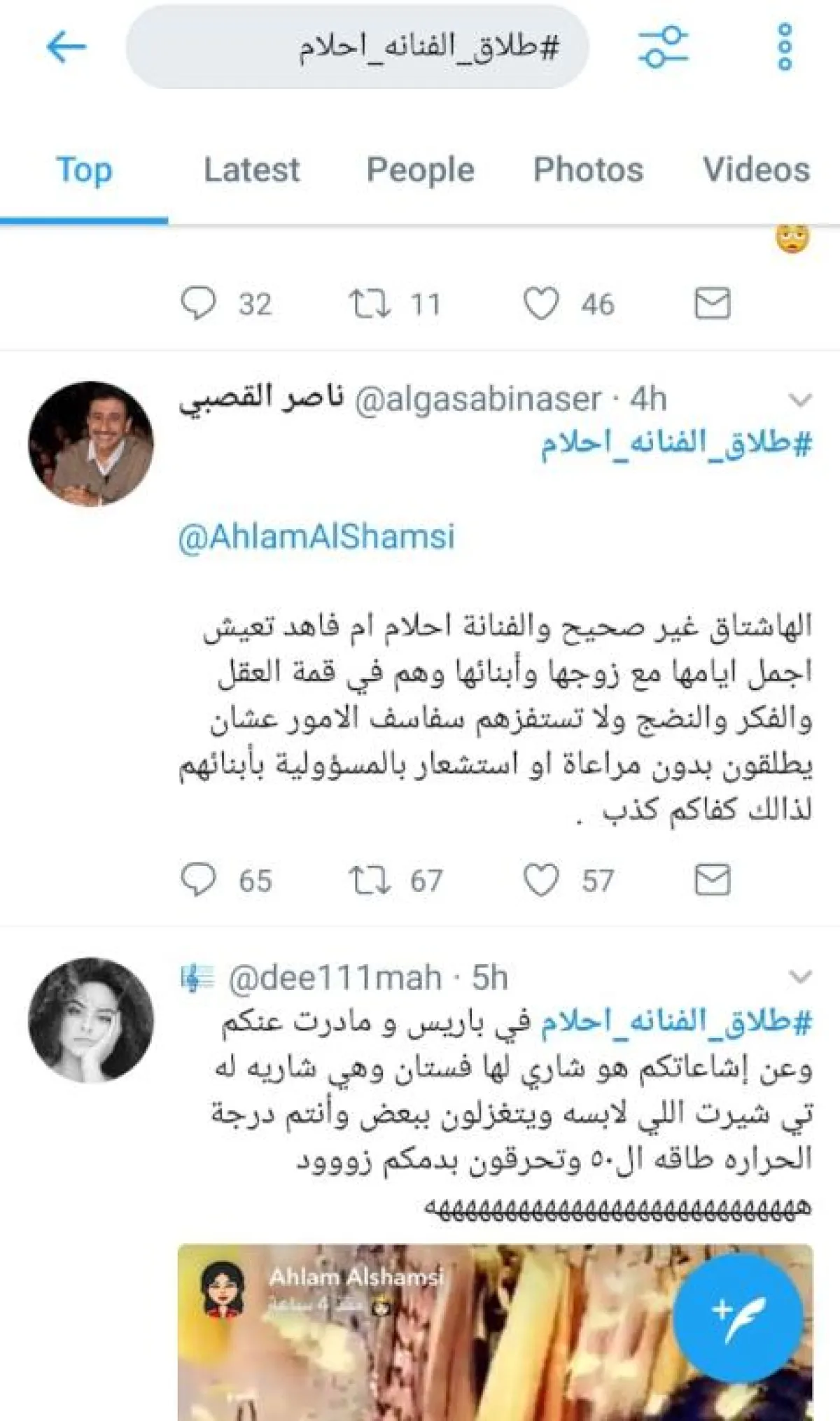 أما اللافت، فكان حساباً مزوّراً باسم الفنان ناصر القصبي يحظى بالكثير من المتابعين، سارع إلى نفي الخبر جملةً وتفصيلاً وكتب "الهاشتاغ غير صحيح والفنانة أحلام تعيش أجمل أيام حياتها مع زوجها وأبنائها وهم في قمة العقل والفكر والنضج ولا تستفزهم سفاسف الأمور عشان يطلقون بدون مراعاة أو استشعار بالمسؤولية بإبنائهم لذلك كفاكم كذب".