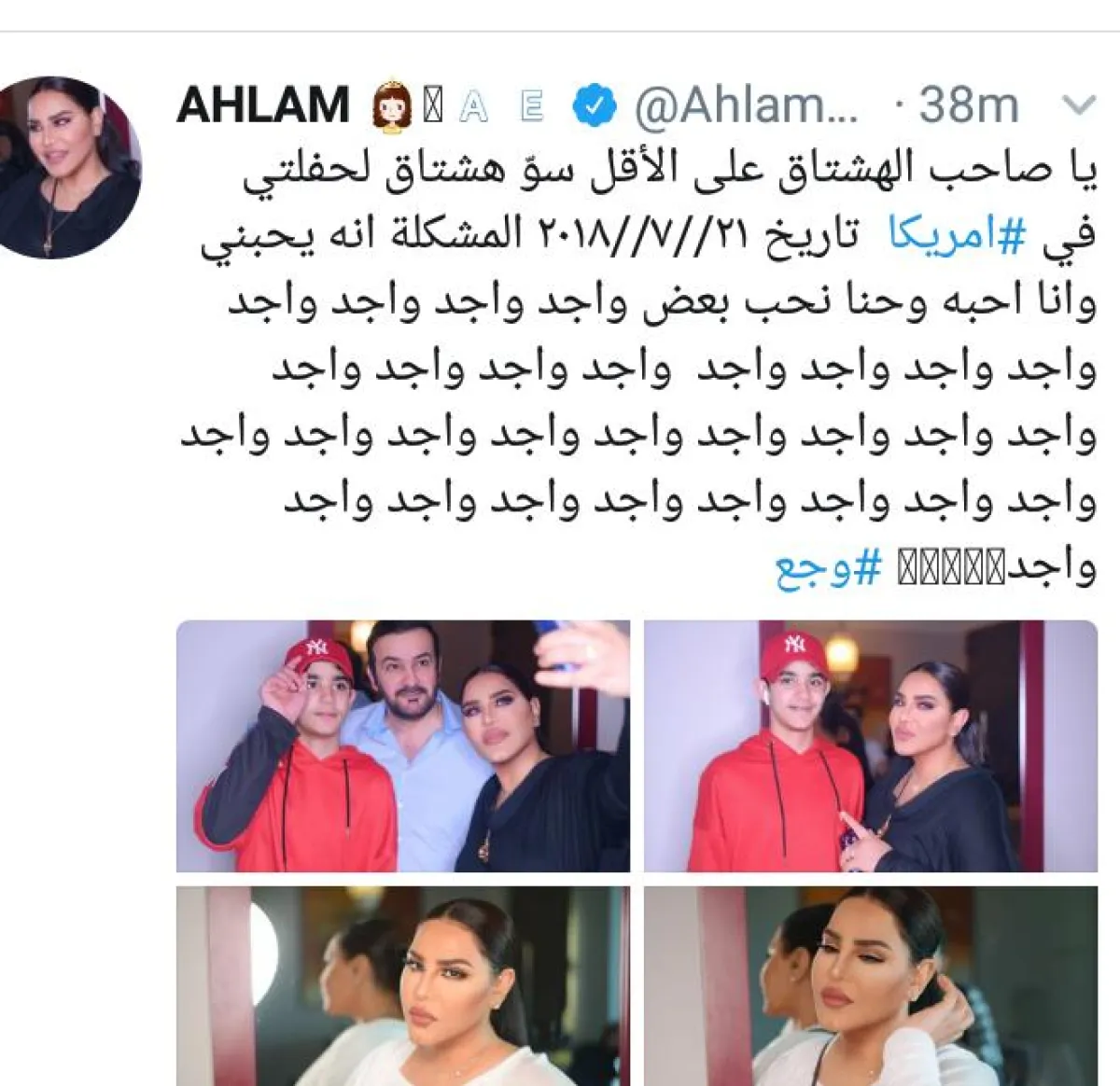 أحلام بدورها حسمت الجدل، فنشرت صوراً تجمعها بزوجها وإبنها خلال وجودهم في باريس وعلّقت "يا اصحاب الهاشتاق سوا هاشتاغ لحفلتي في اميركا تاريخ 21\7\2018 . المشكلة أنه يحبني وأنا أحبه واحنا نحب بعض واجد واجد.".